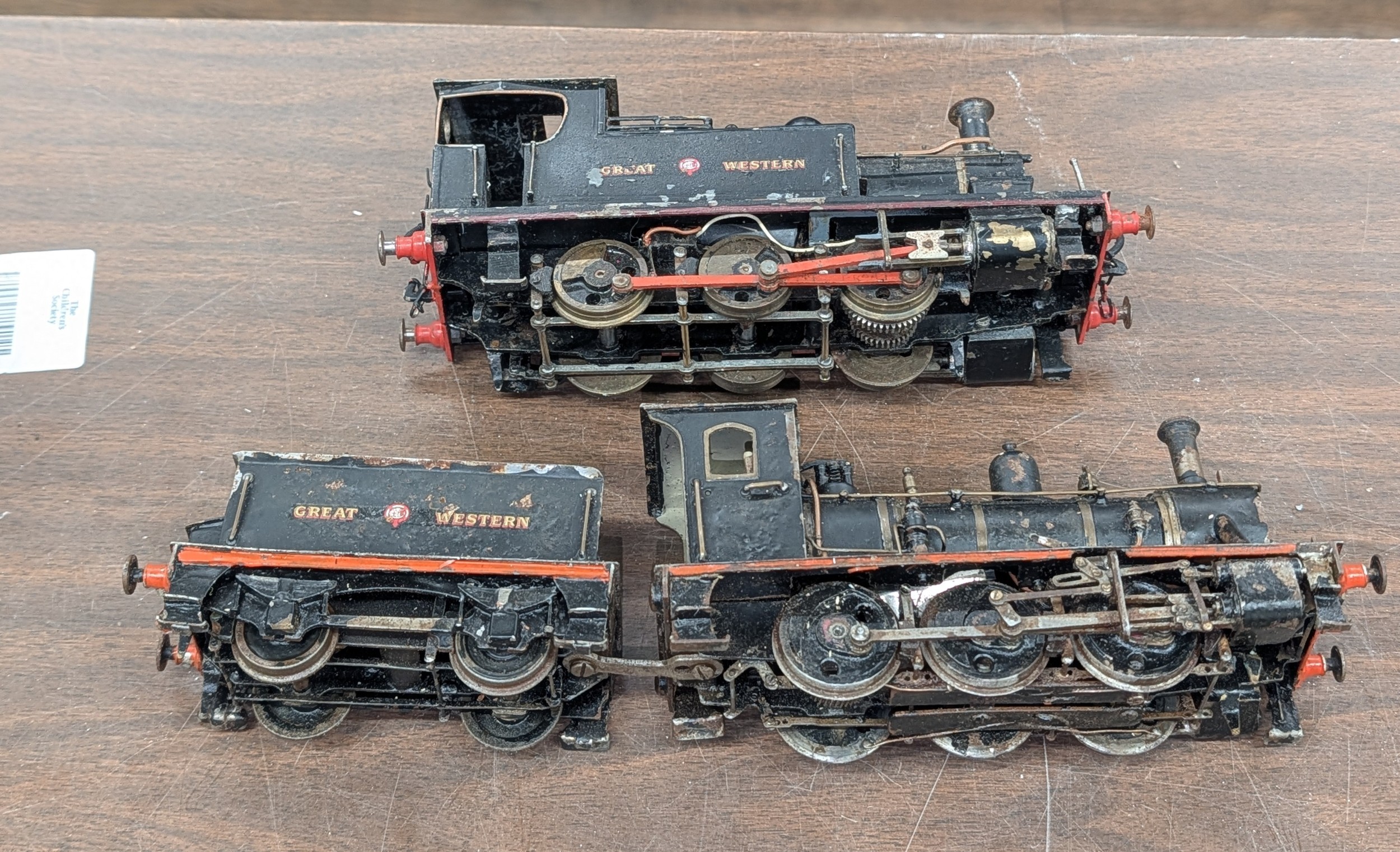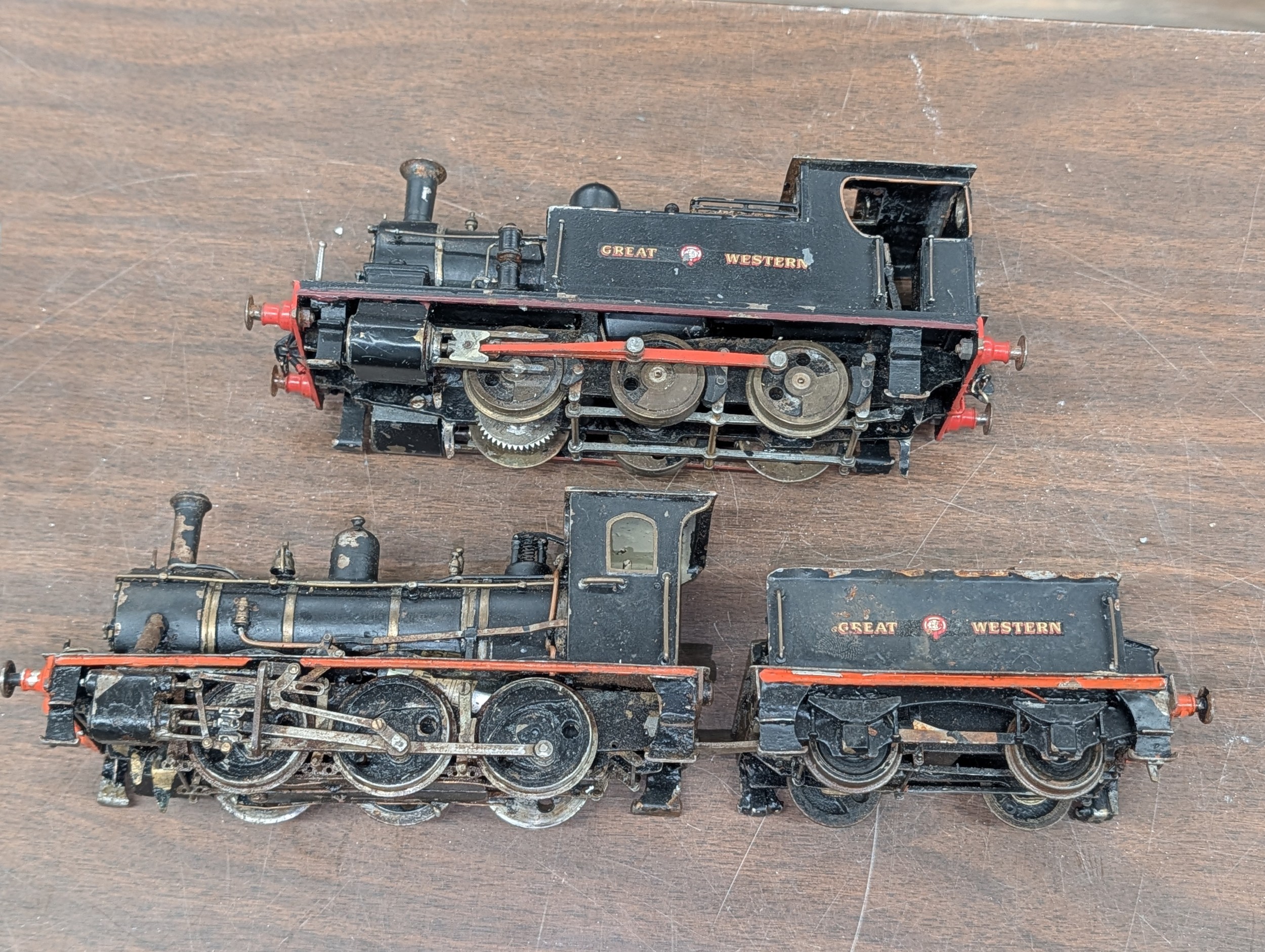 Three O Gauge Clockwork Model Steam Locomotives and Tender in Great Western Railway Livery