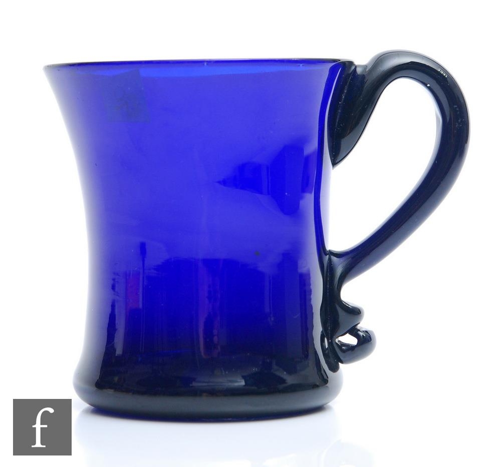 A late Georgian Bristol Blue tankard, circa 1810, the waisted body with high loop handle with scroll kick, height 10cm.