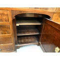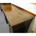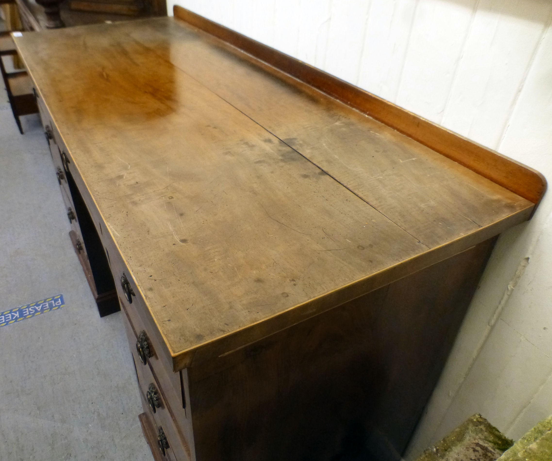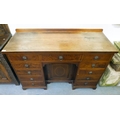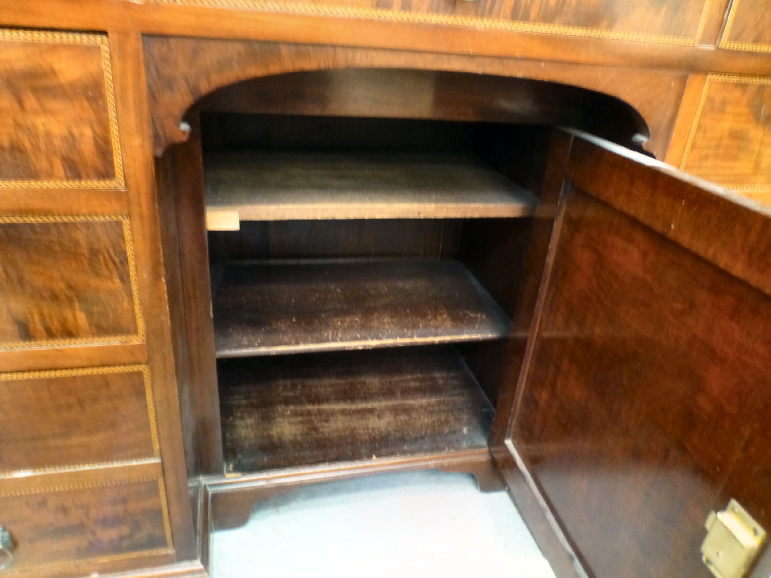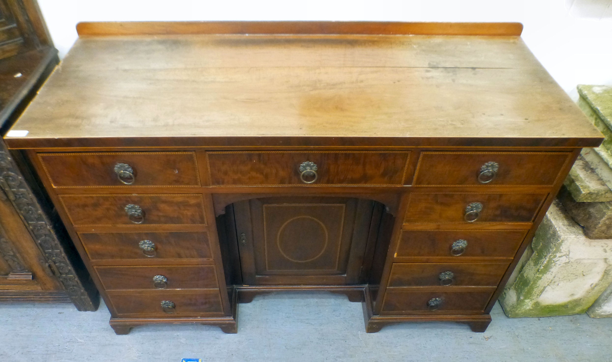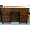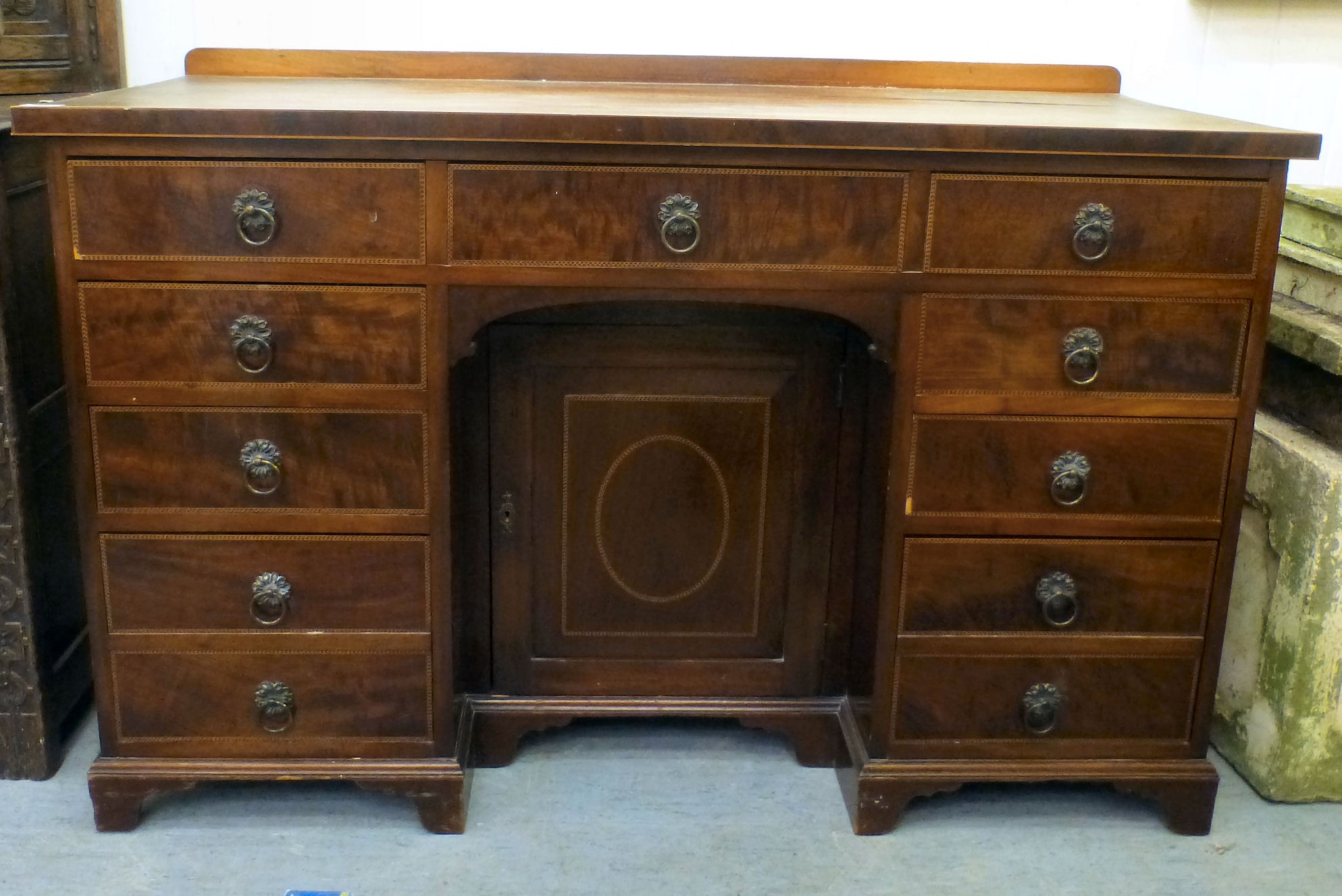 An Edwardian ebony and string inlaid mahogany one piece, nine drawer, twin pedestal desk, on a plinth 33"h 52"w