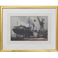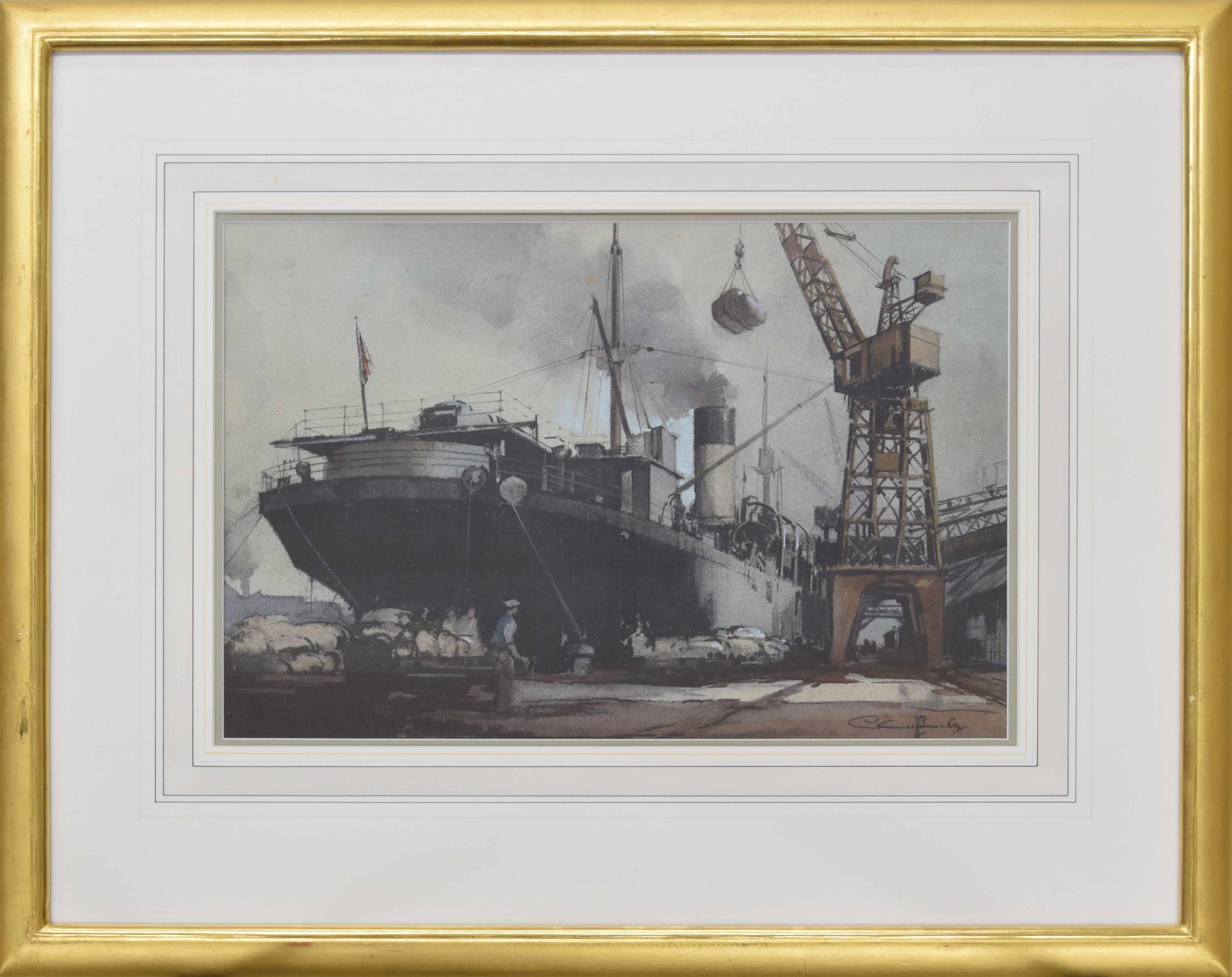 Claude Henry Buckle RI., RSMA., (1905-1973) - Boat in a shipyard being unloaded by figures beside a crane, signed, pencil charcoal and watercolour, heightened with white possibly on tinted paper signed 11.5" x 16.75"