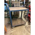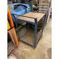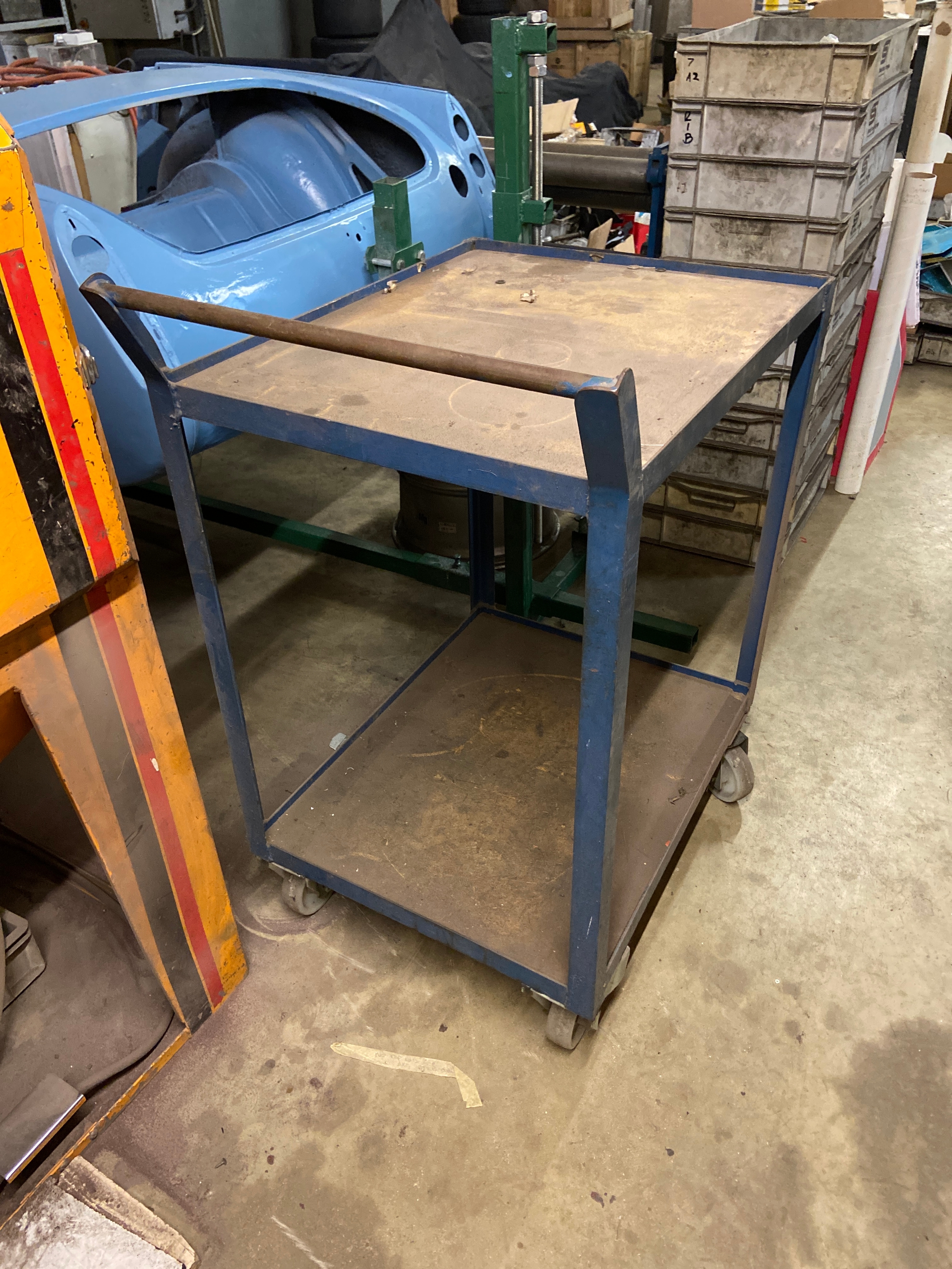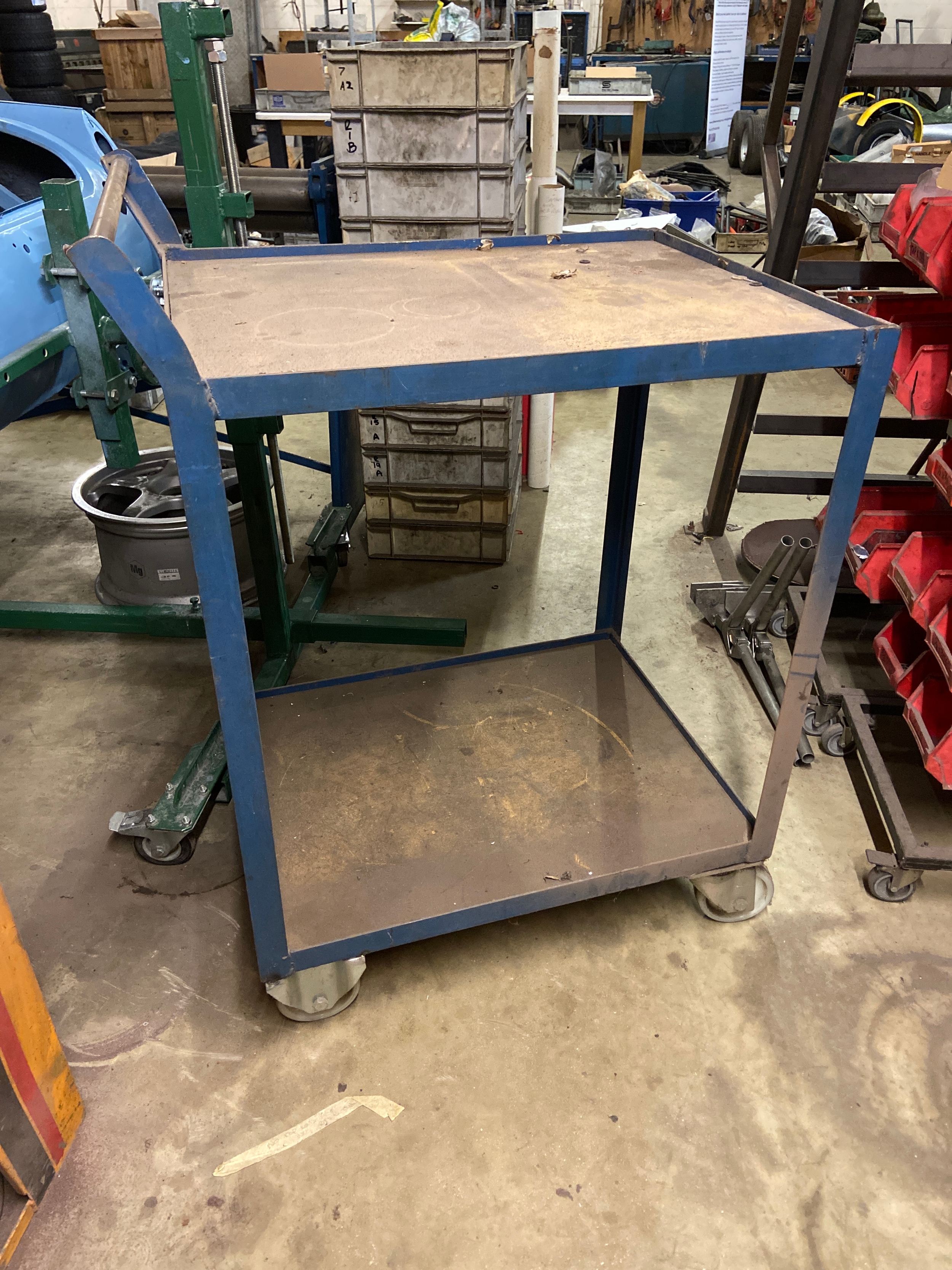 Two tier engineering workshop wheeled trolley. Heavily fabricated in house by Pilbeam. Approx 77cm x 62cm x 100cm tall (top tier).