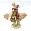 A Royal Dux Pottery Centrepiece, modelled as a maiden holding a fishing net and seated on a rock between two large shells, pink triangle mark, shape number 1125, 35cm high.
