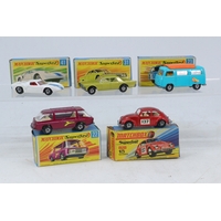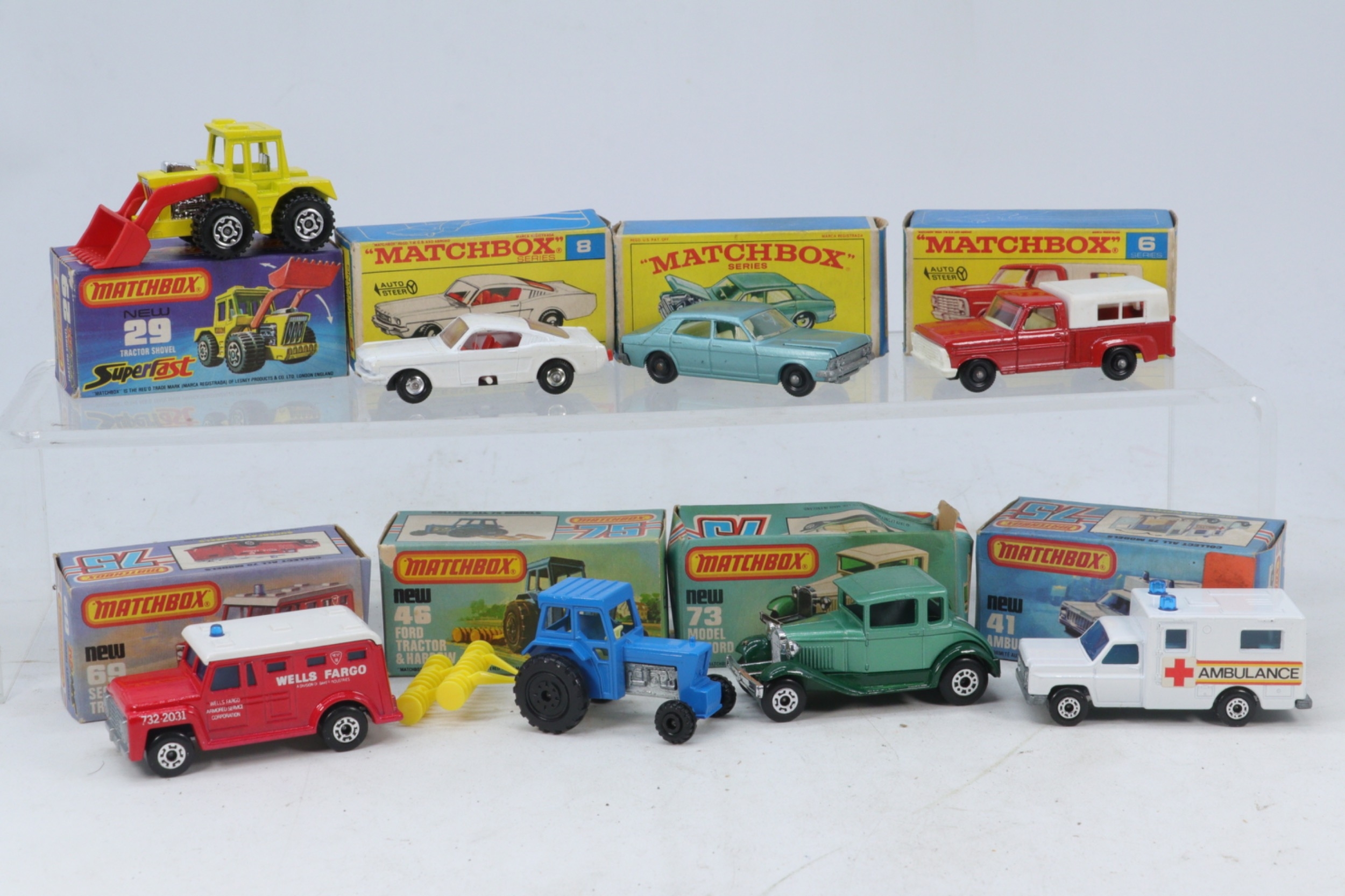 Five boxed Matchbox 75 diecast vehicles to include 73 model 'A' Ford, 69 Security Truck, 41 Ambulance, and 29 Tractor Shovel together with three boxed Matchbox Series diecast vehicles including 53Ford Zodiac MK IV, 8 Ford Mustang and 6 Ford Pickup