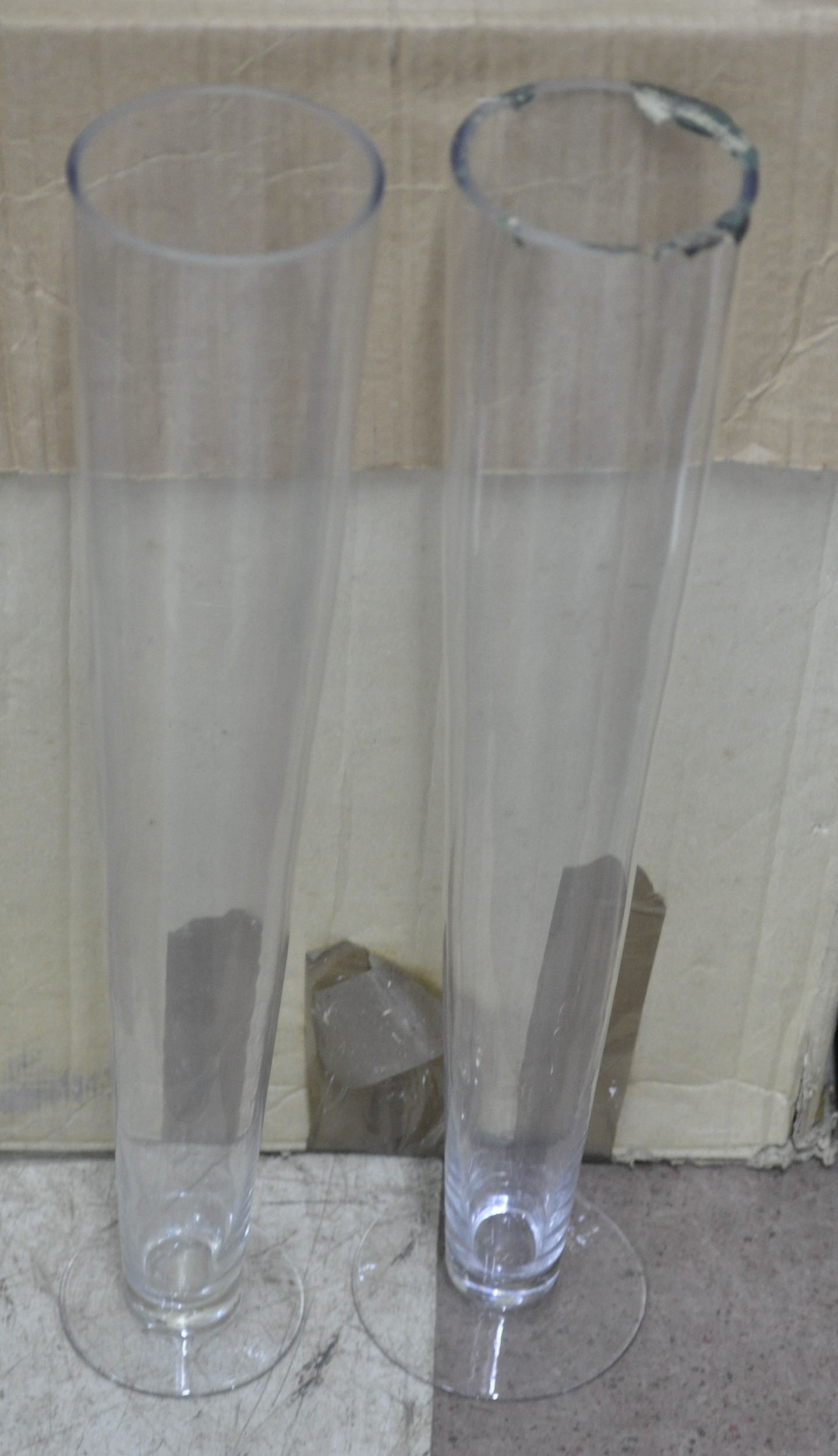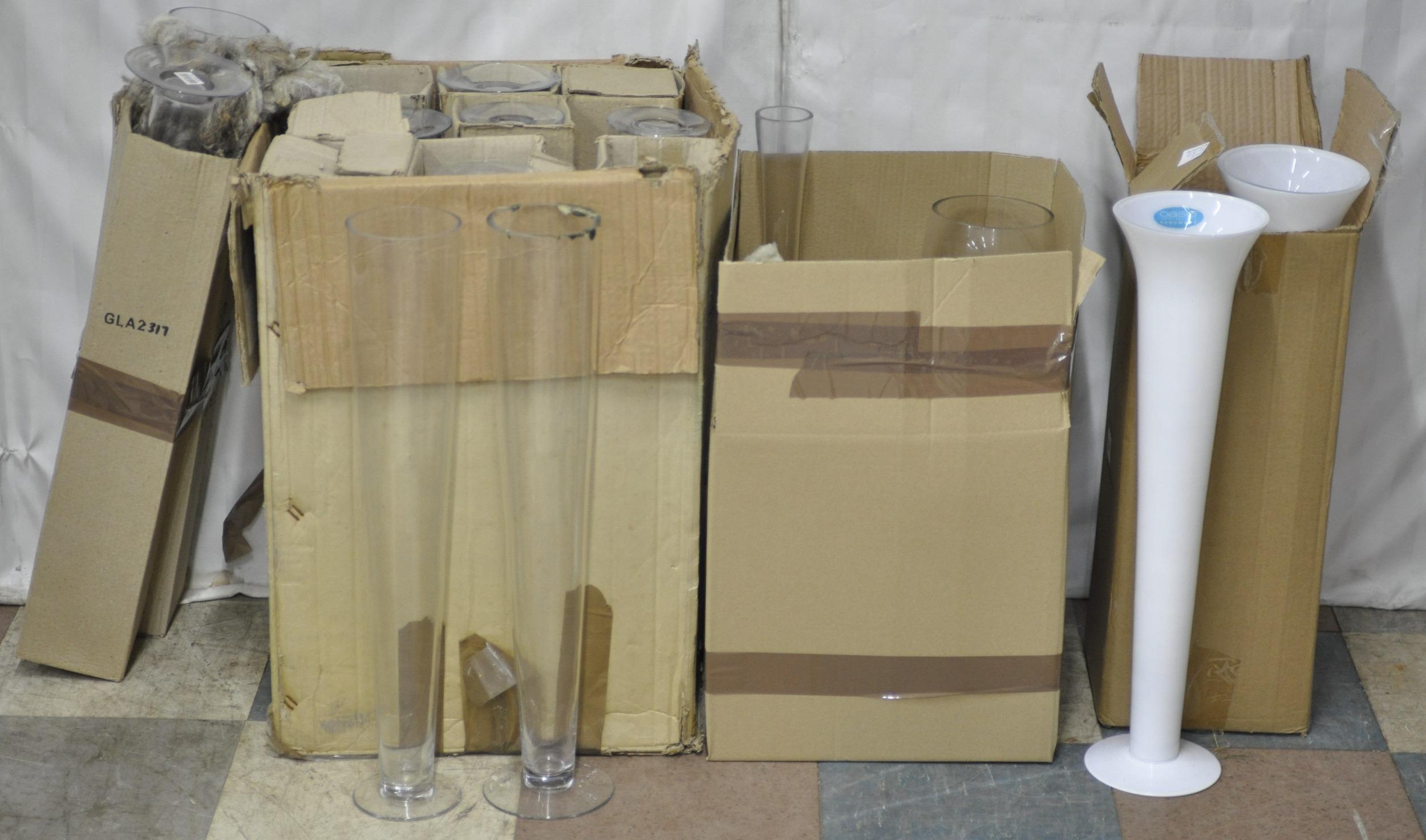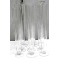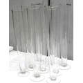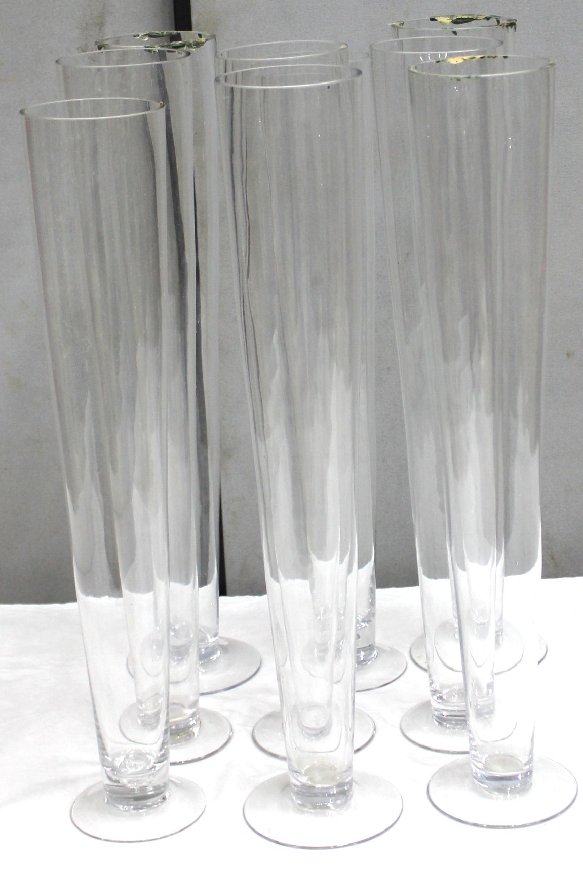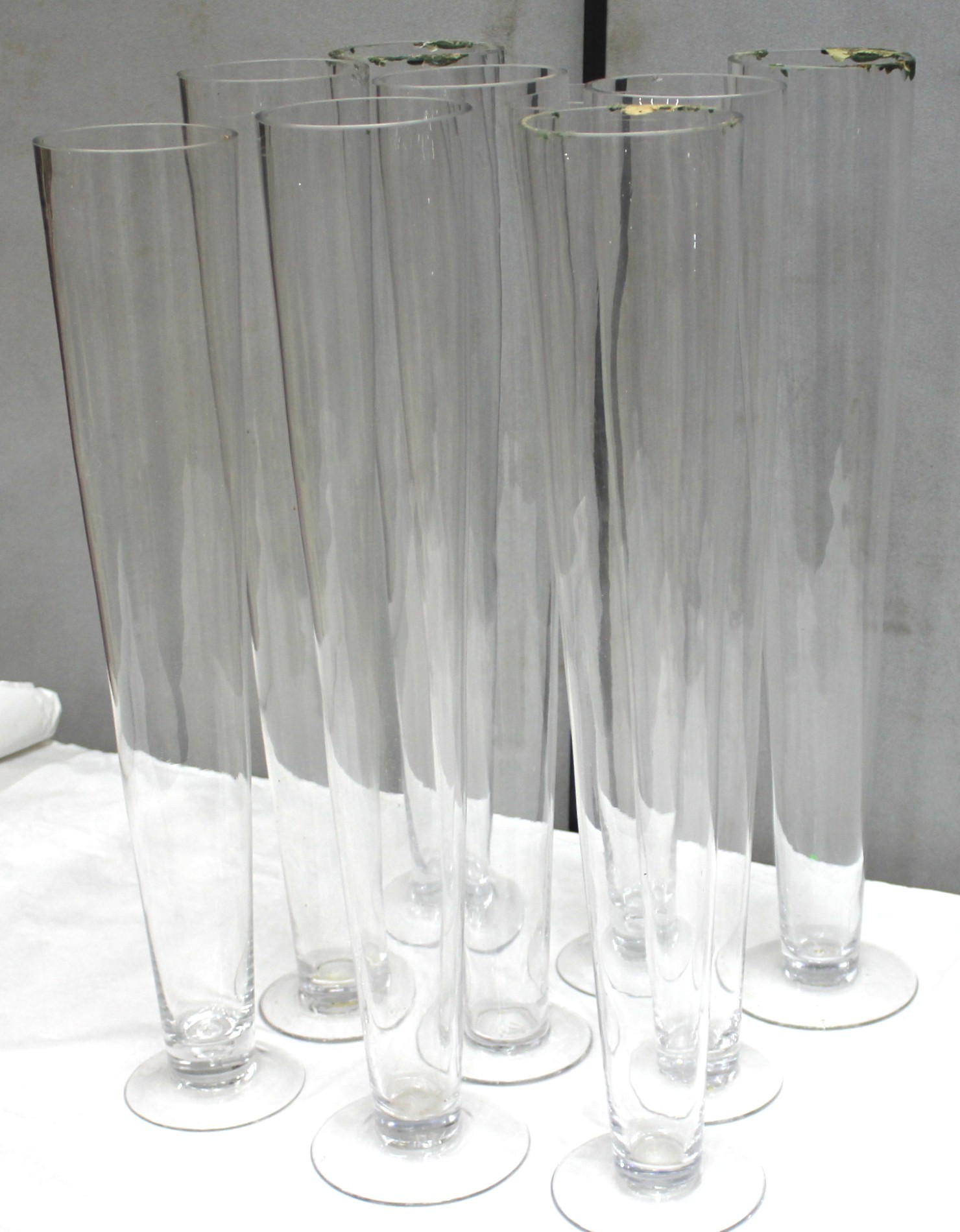 VARIOUS LARGE GLASS VASES INCLUDING A SET OF 9 TALL STEM GLASSES CONICAL VASES