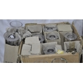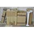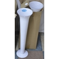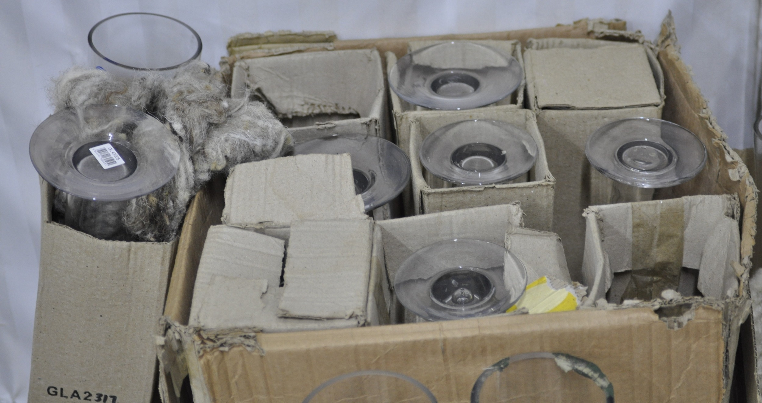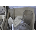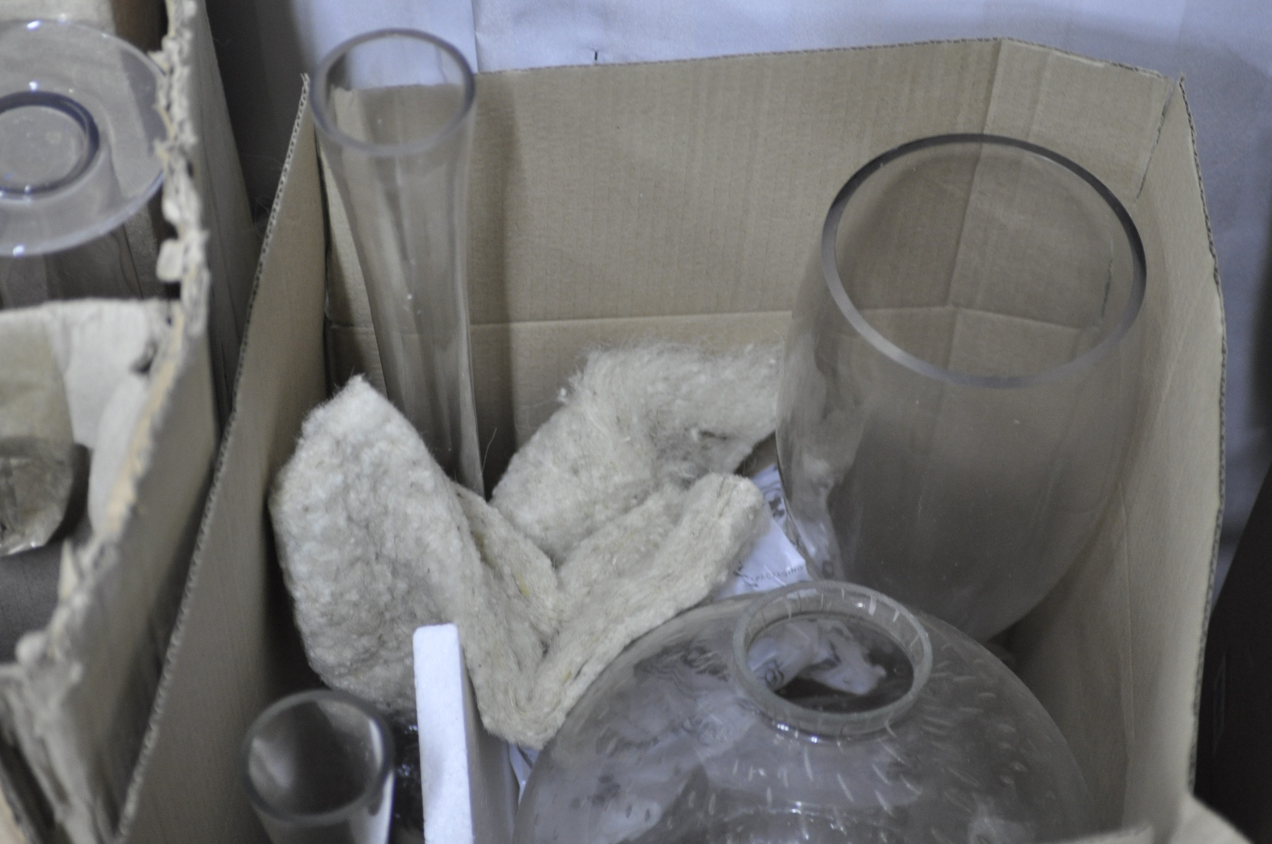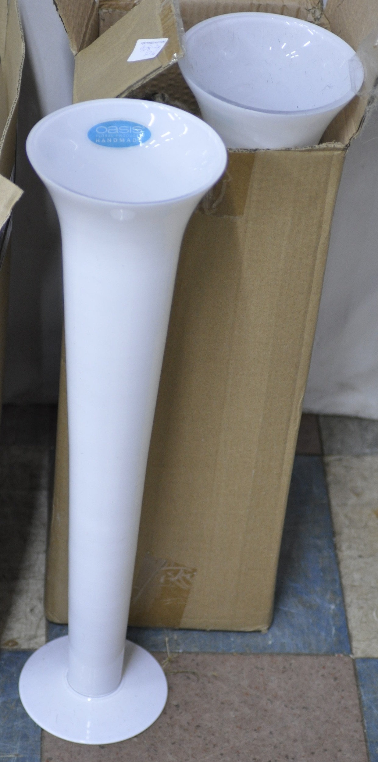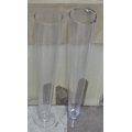 VARIOUS LARGE GLASS VASES INCLUDING A SET OF 9 TALL STEM GLASSES CONICAL VASES