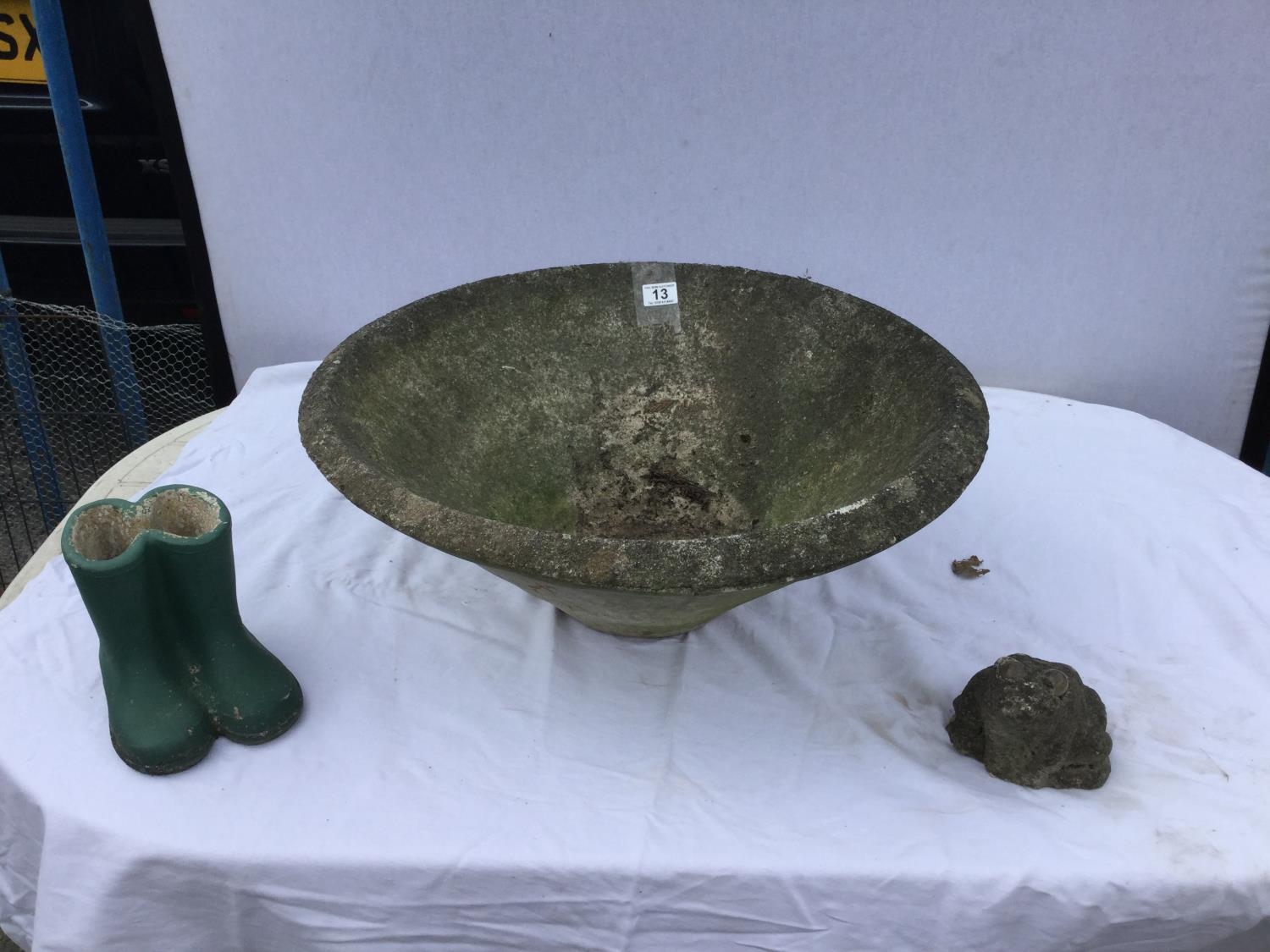 LARGE GARDEN PLANTER AND 2 GARDEN ORNAMENTS