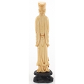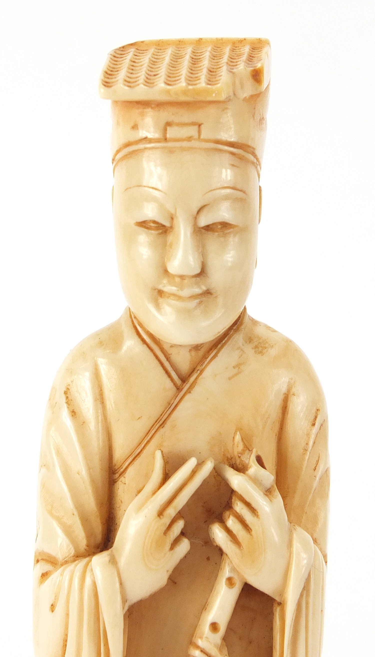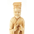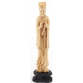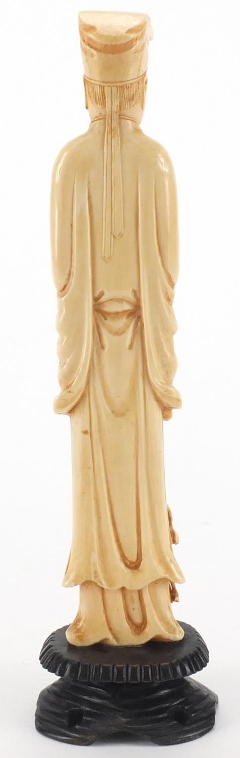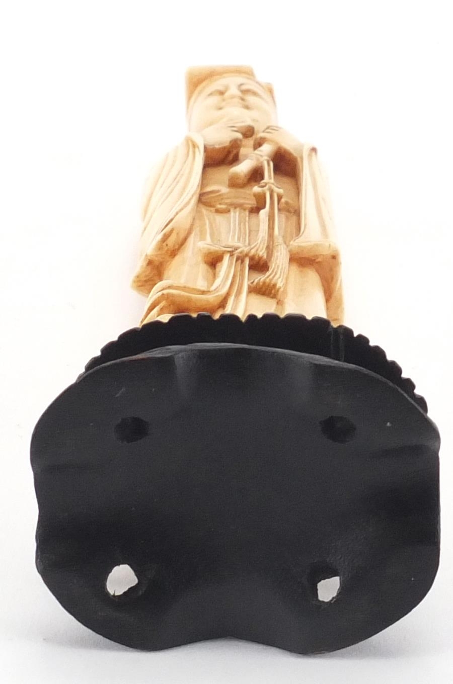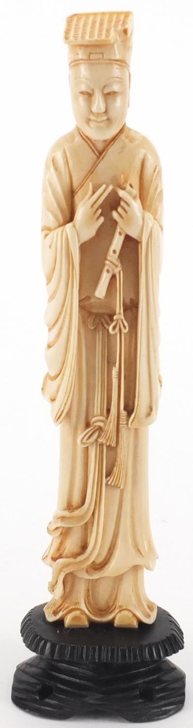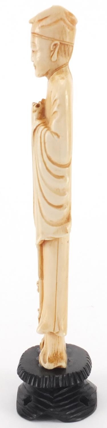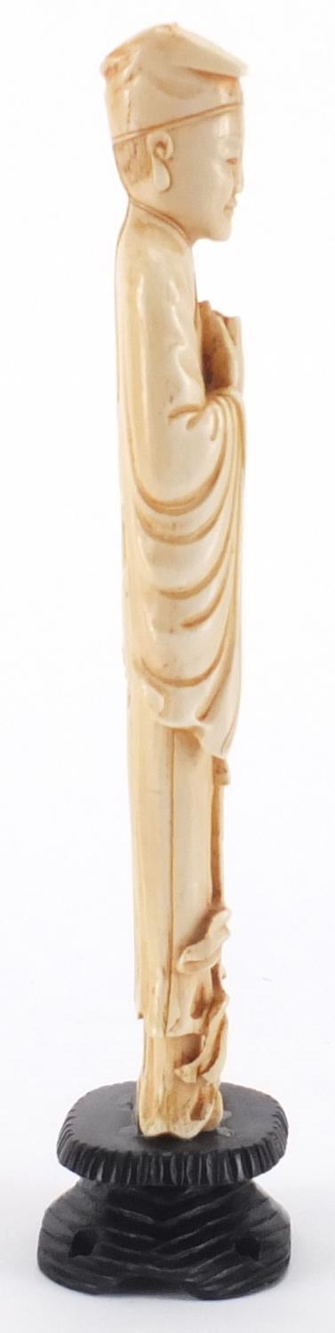 Chinese carved ivory okimono of a gentleman holding a scroll, on hardwood stand, 22cm high