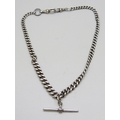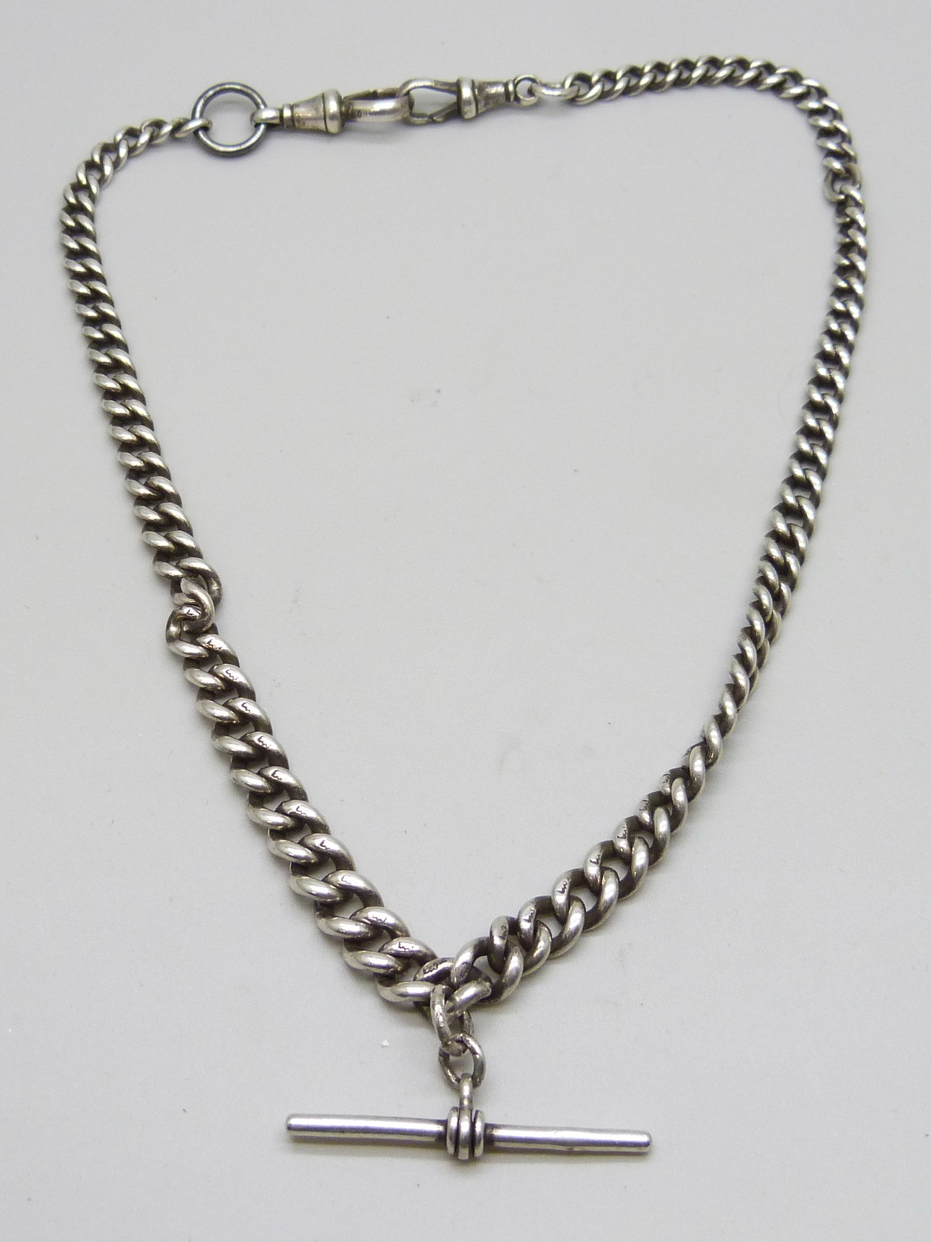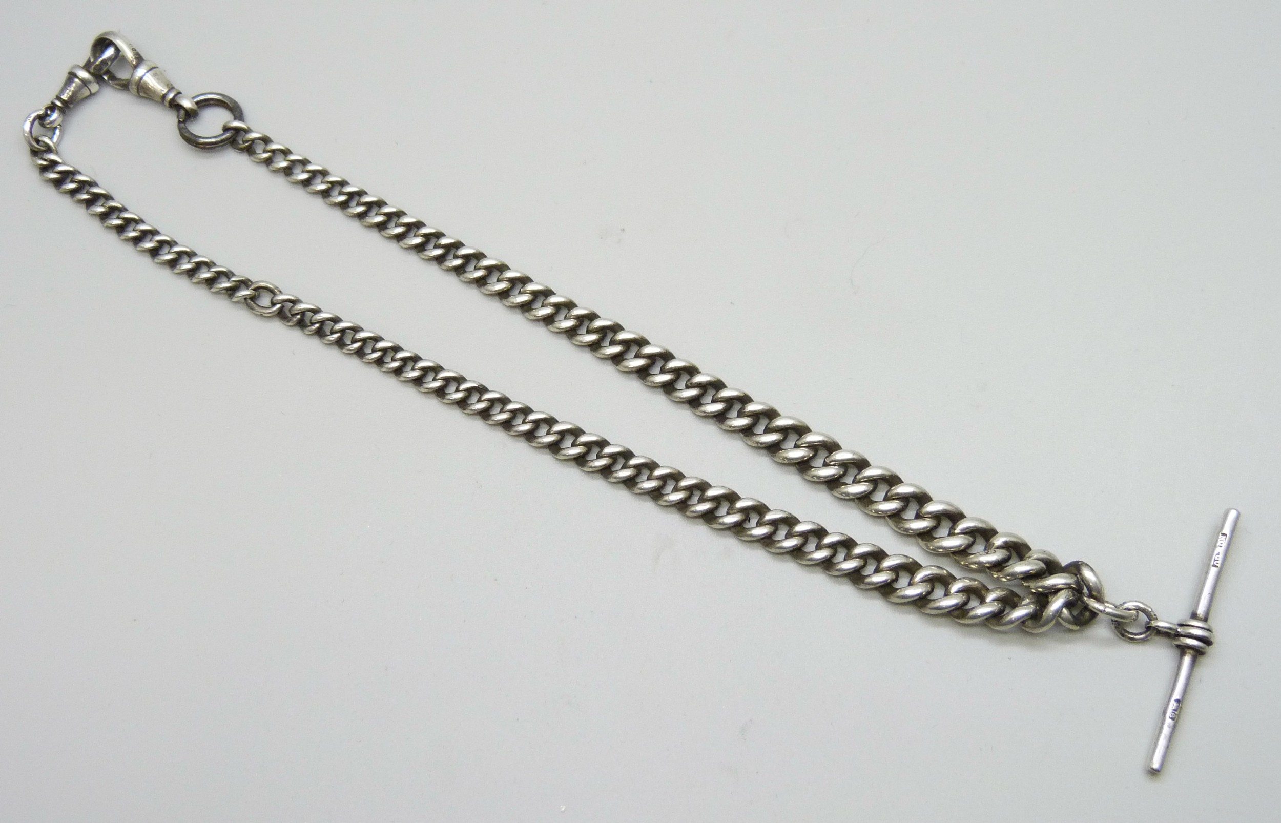A silver graduated double Albert chain with two silver dog clips (unmatched), and a silver T bar, one side longer, base metal loop, 36g, 38.5cm