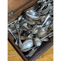 Silver plated cutlery in and early 20th century oak box. 54.5x24.5x8.5cm.