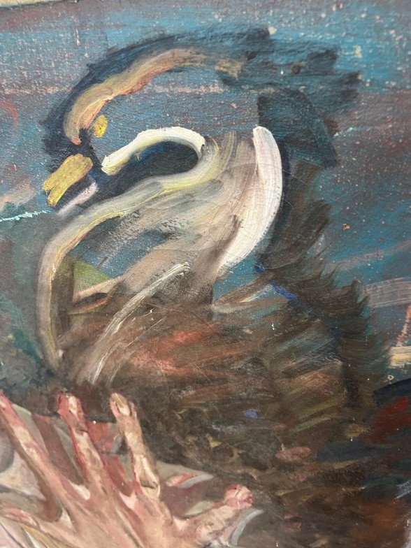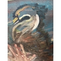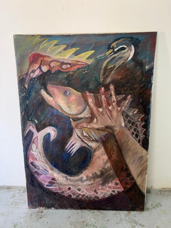 A contemporary oil on canvas of a central fish being grasped by a human hand 31cm x 111cm