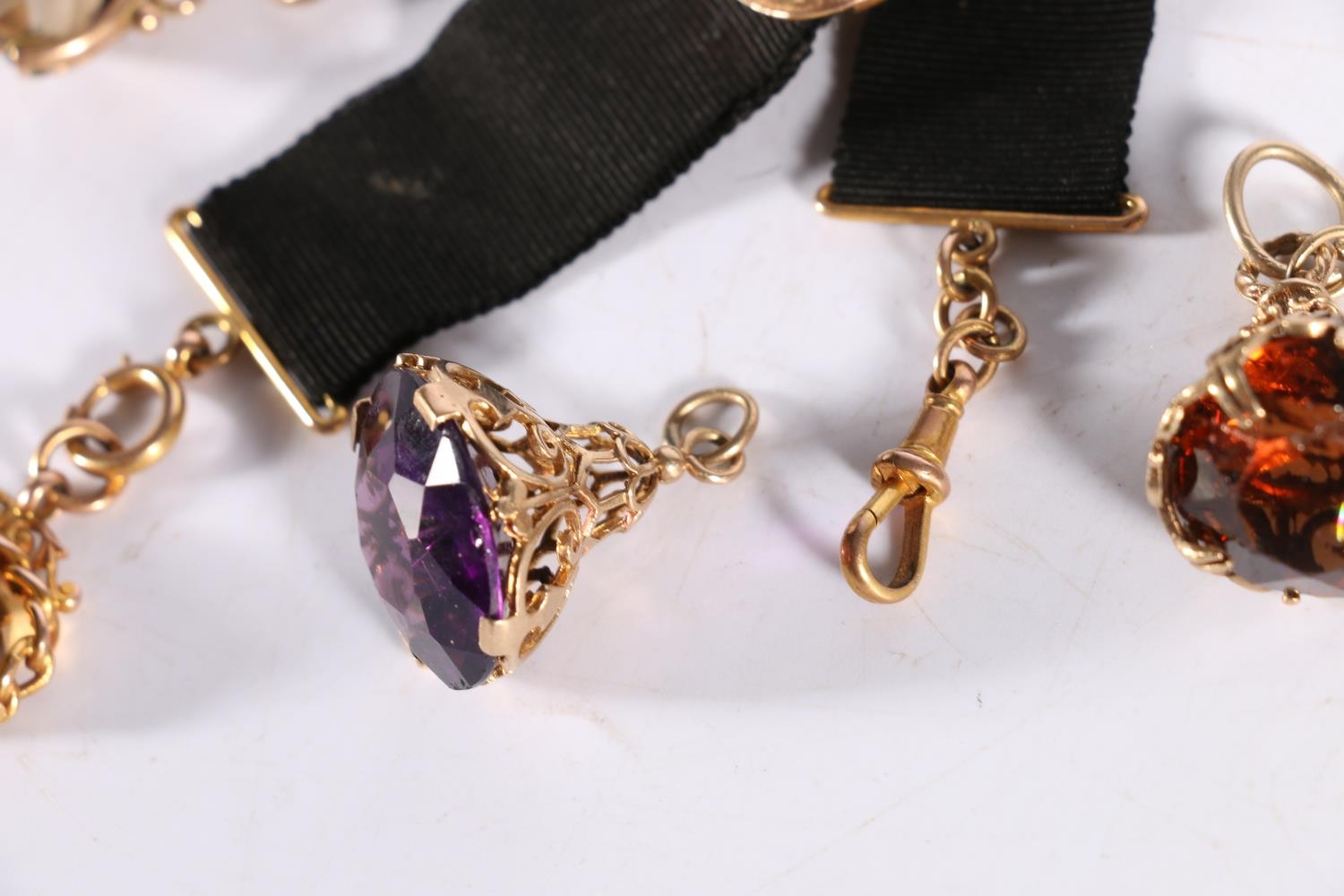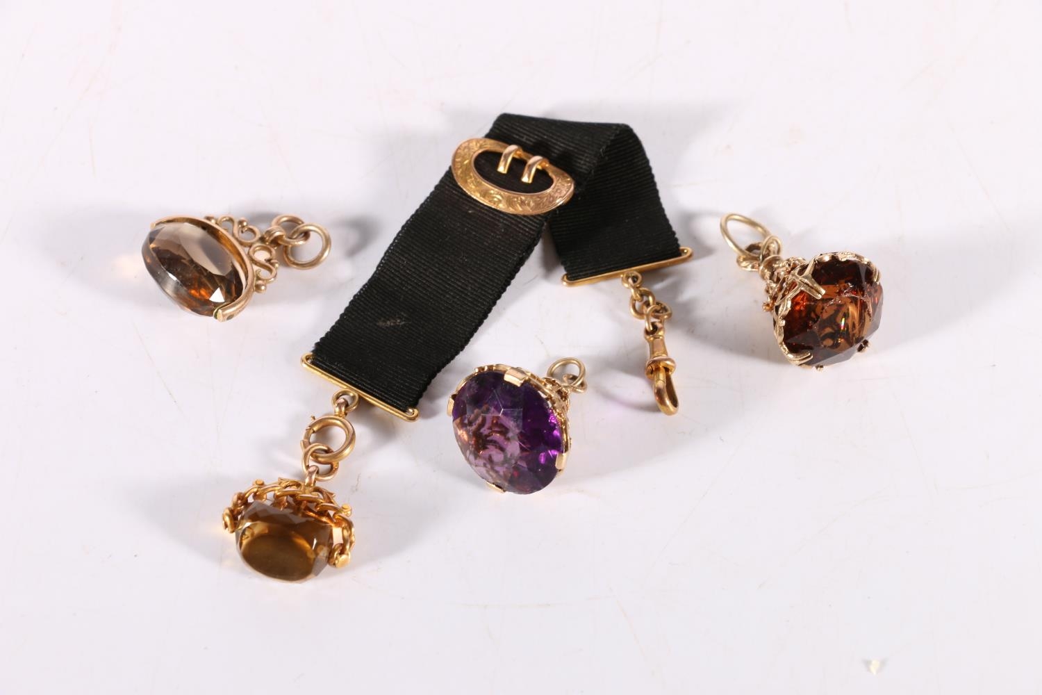 Four 9ct gold mounted faceted citrine and amethyst fobs, 29.7g gross