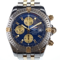 The case is made of stainless steel. Original Breitling Stainless Steel bracelet. Sapphire crystal. Blue sunburst dial w/ Arabic numerals.