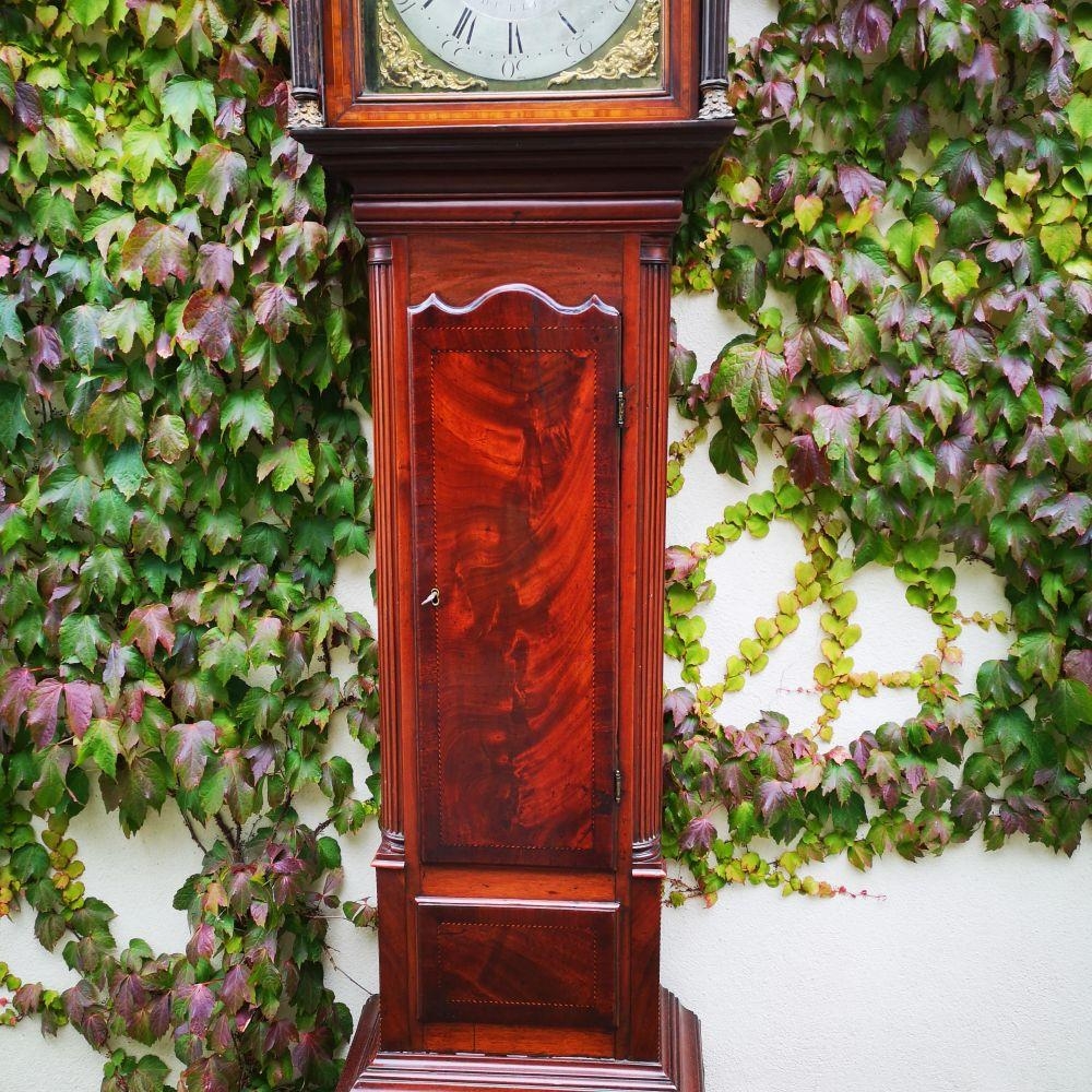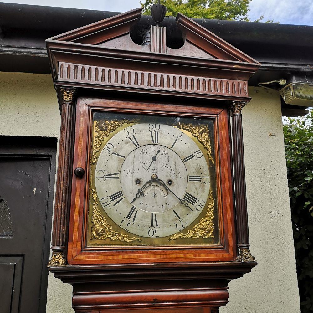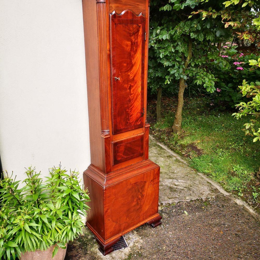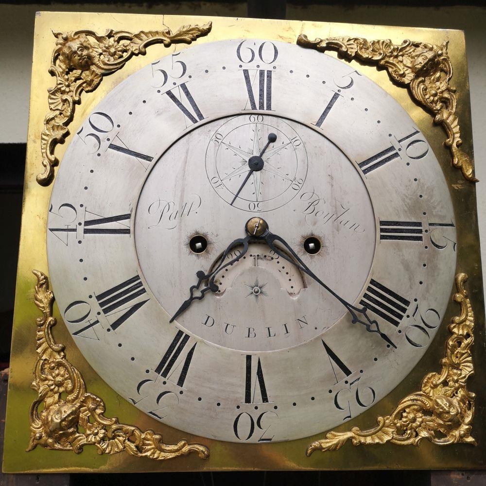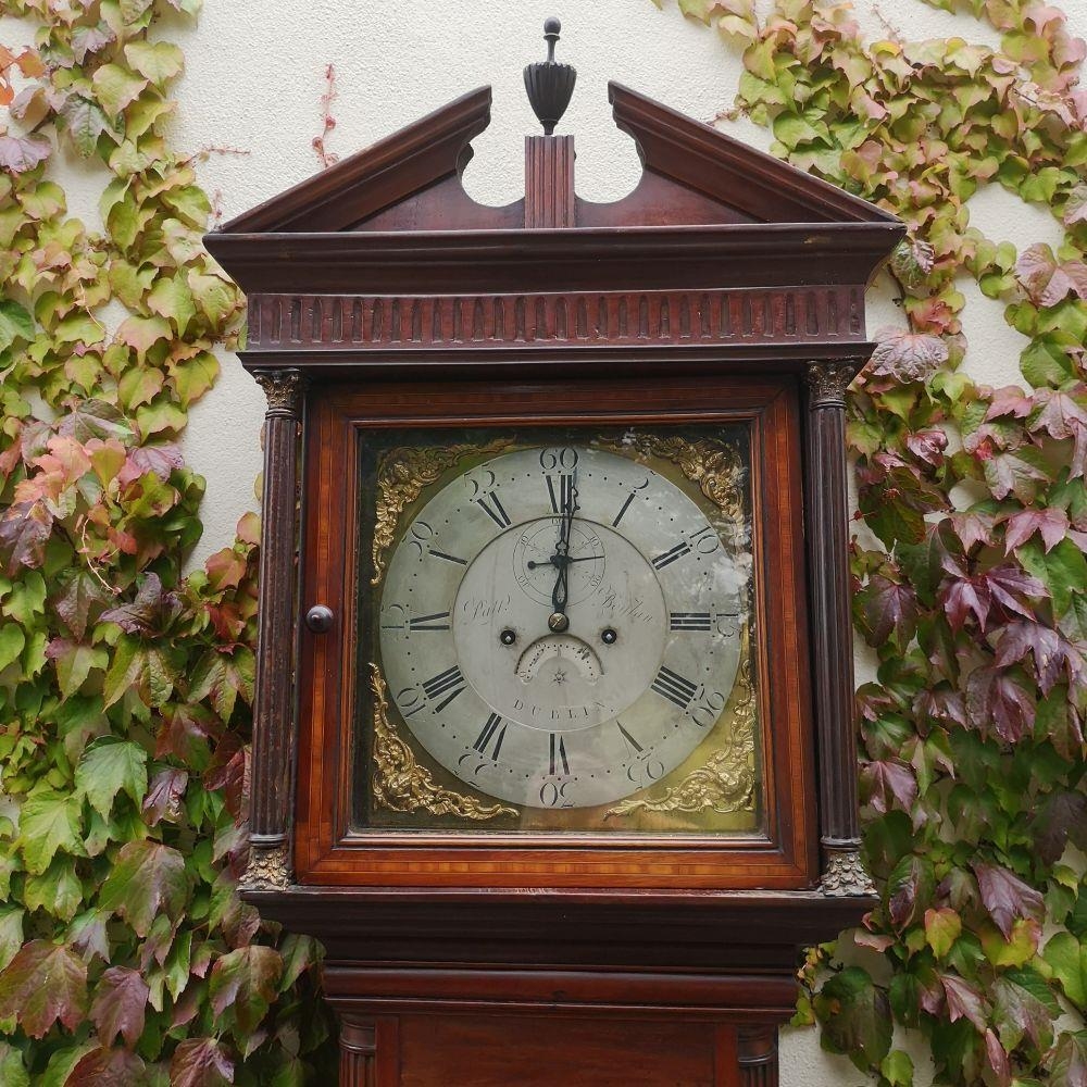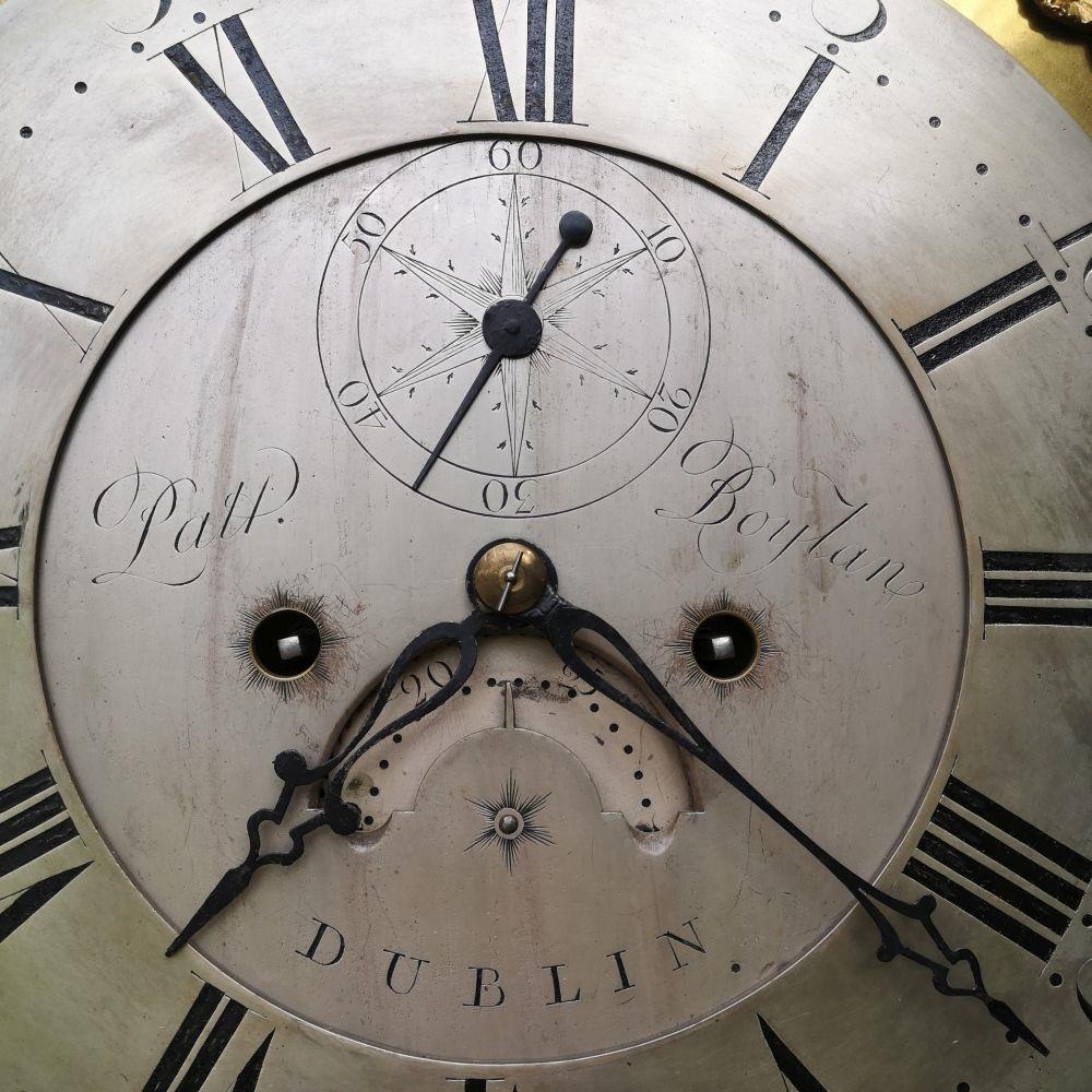 A VERY FINE IRISH GEORGIAN MAHOGANY LONGCASE CLOCK BY PAT BOYLAN, DUBLIN, circa 1770. In good working order. The stunning case stands at 7ft 6”, with a breakfront pediment top and fluted detail beneath, on either side of the satinwood inlaid dial door stand Corinthian columns with foliage detail, a flame mahogany door is found beneath, and a lovely inlaid detail to the base, all rests on ogee shaped bracket feet. Condition: free from worm, slight chip to good moulding as see in photos. Comes with period iron weights, pendulum and key.