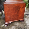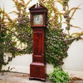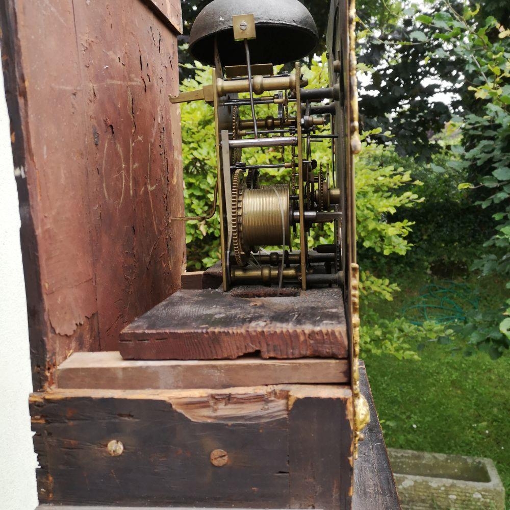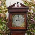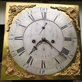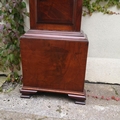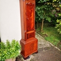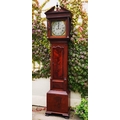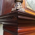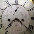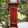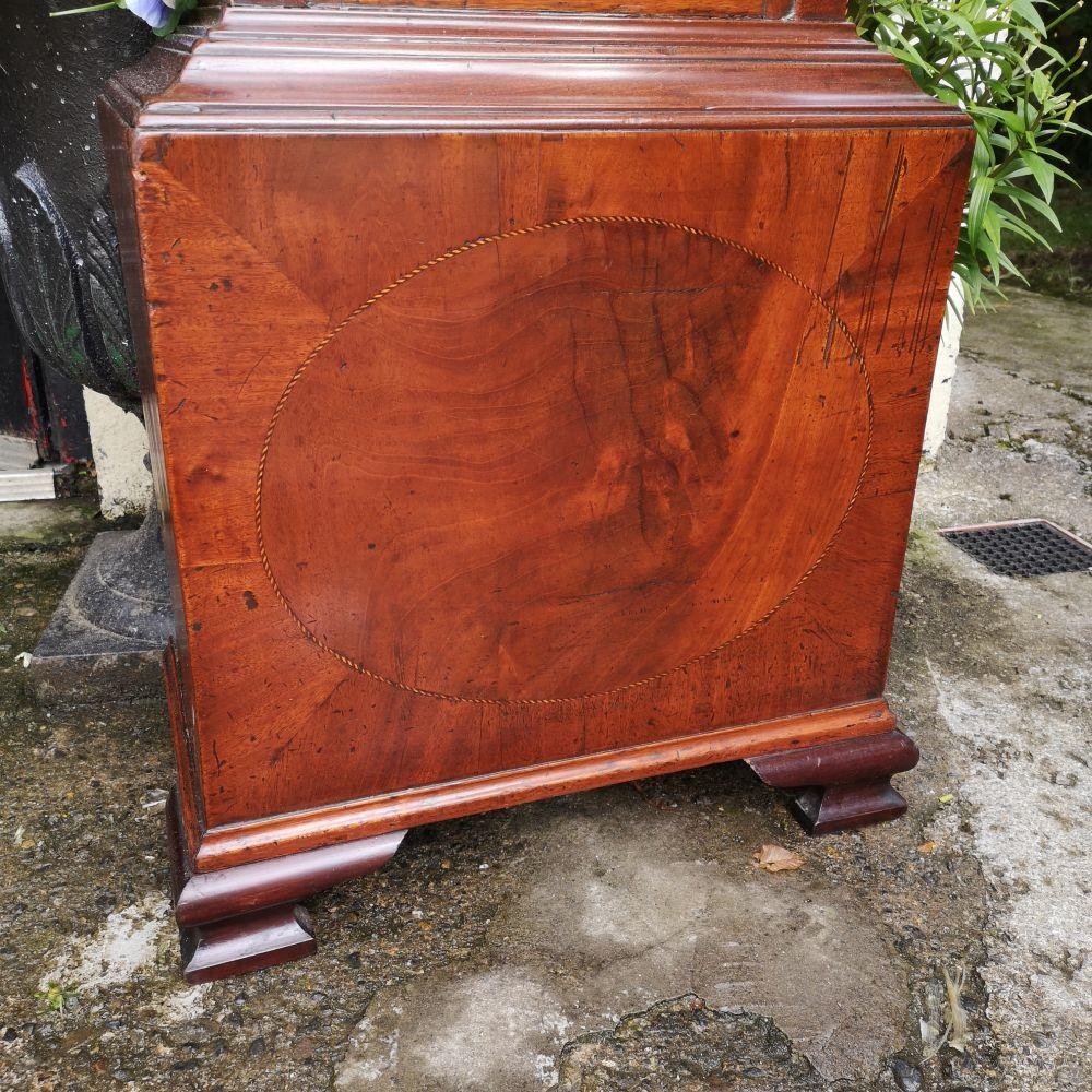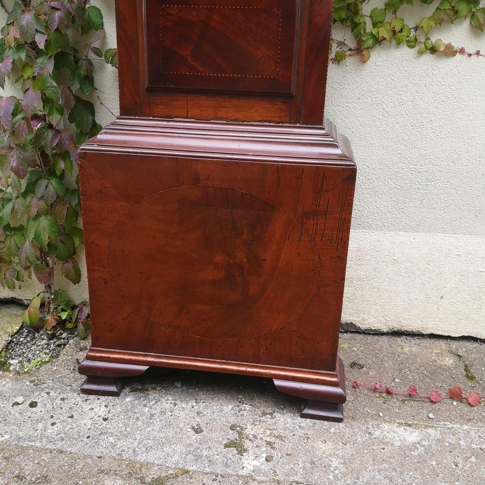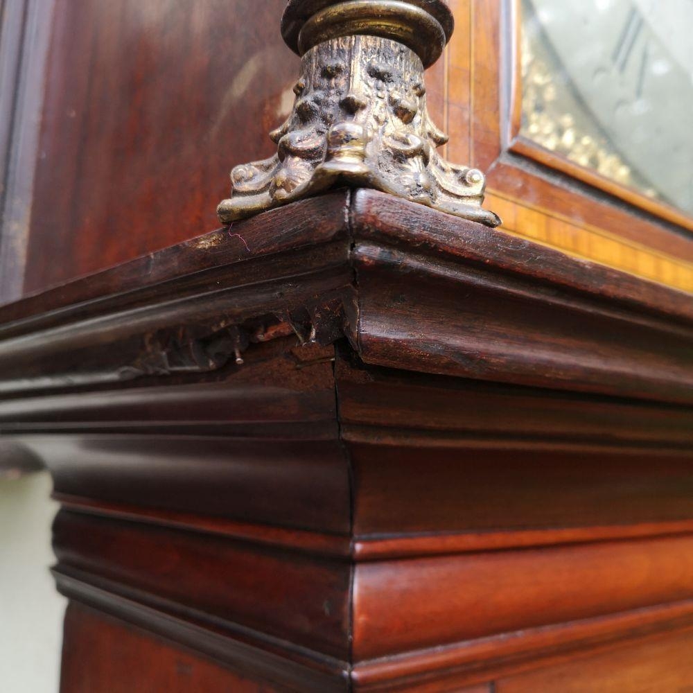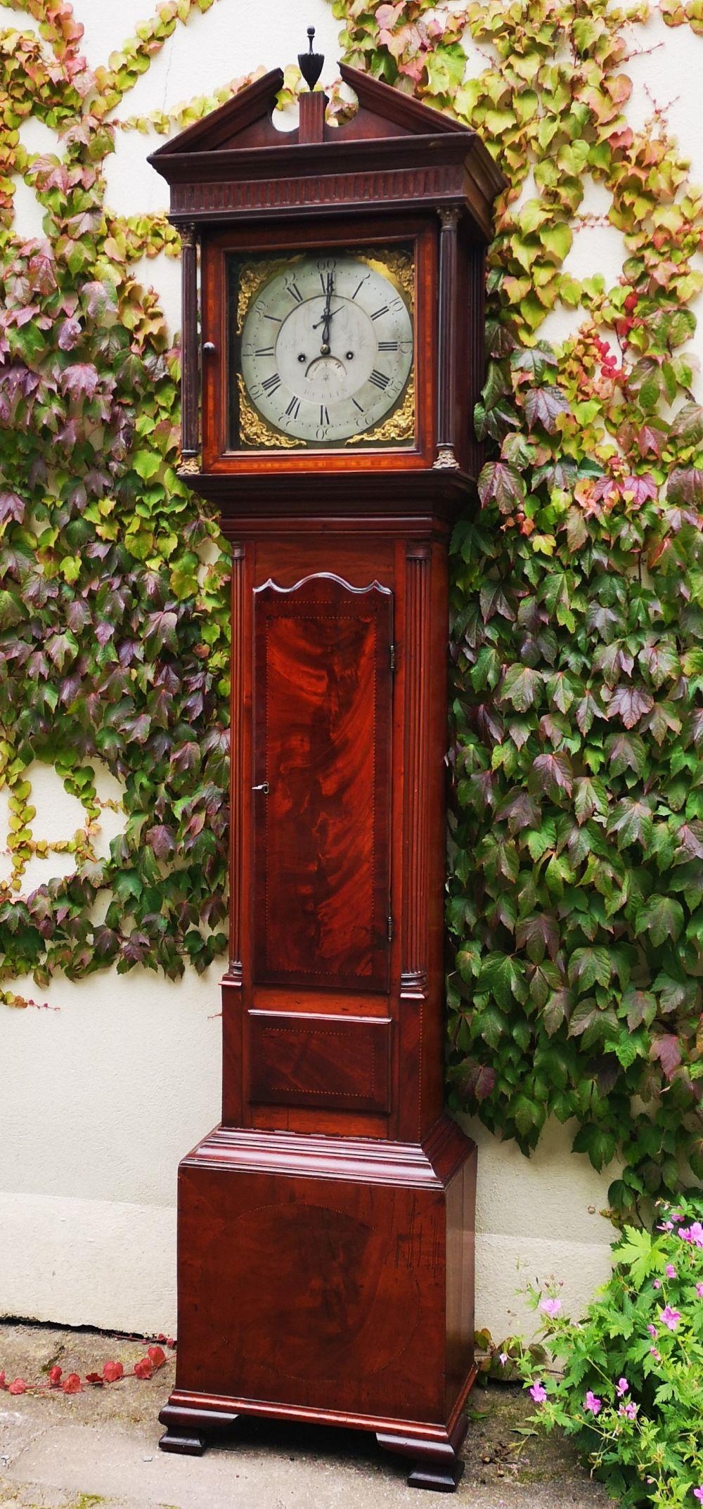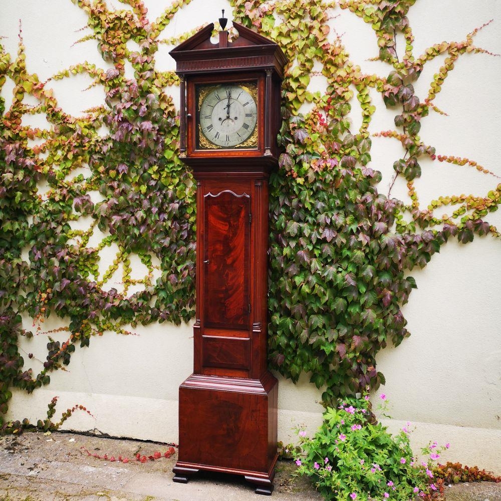 A VERY FINE IRISH GEORGIAN MAHOGANY LONGCASE CLOCK BY PAT BOYLAN, DUBLIN, circa 1770. In good working order. The stunning case stands at 7ft 6”, with a breakfront pediment top and fluted detail beneath, on either side of the satinwood inlaid dial door stand Corinthian columns with foliage detail, a flame mahogany door is found beneath, and a lovely inlaid detail to the base, all rests on ogee shaped bracket feet. Condition: free from worm, slight chip to good moulding as see in photos. Comes with period iron weights, pendulum and key.