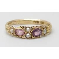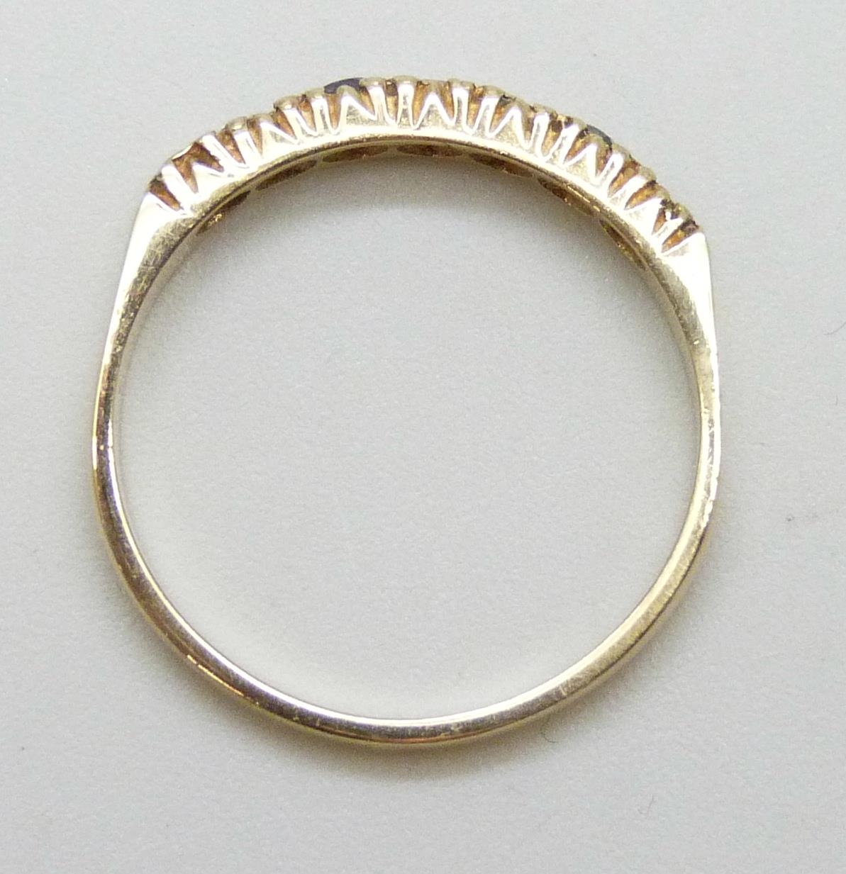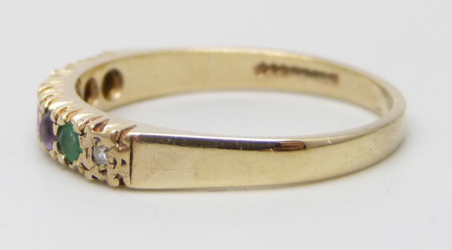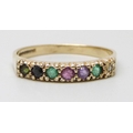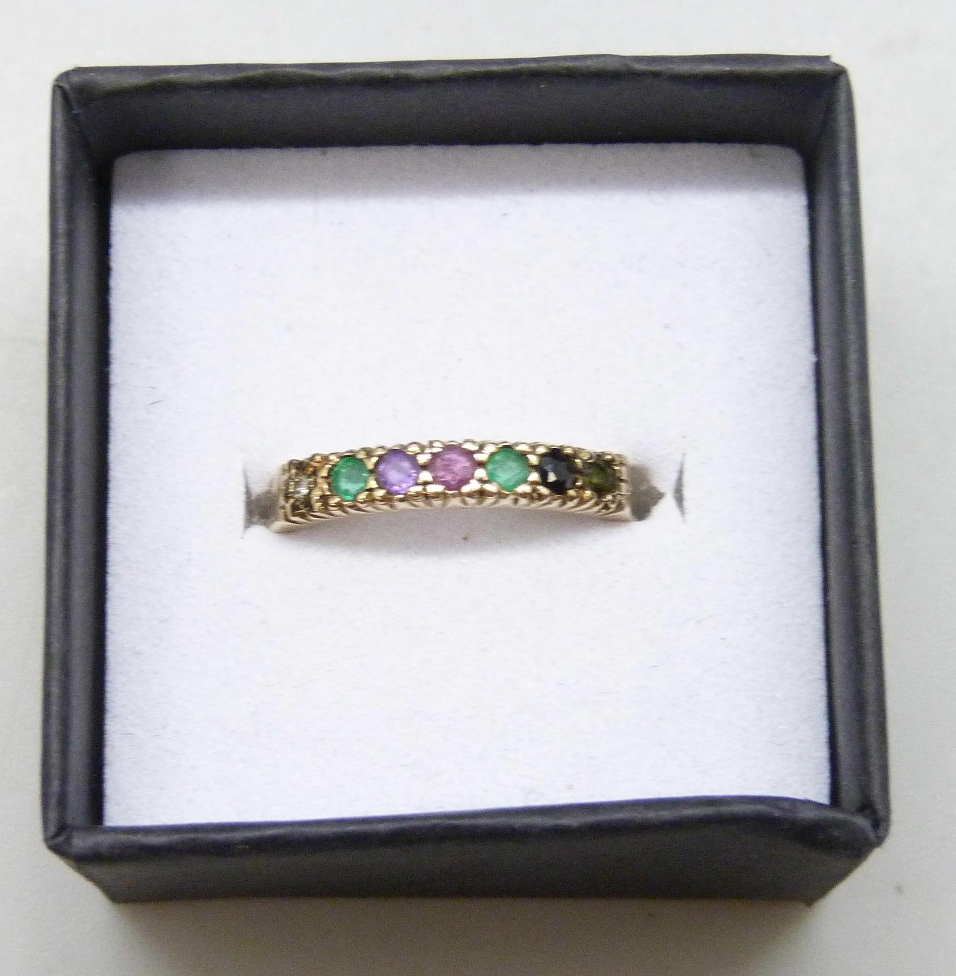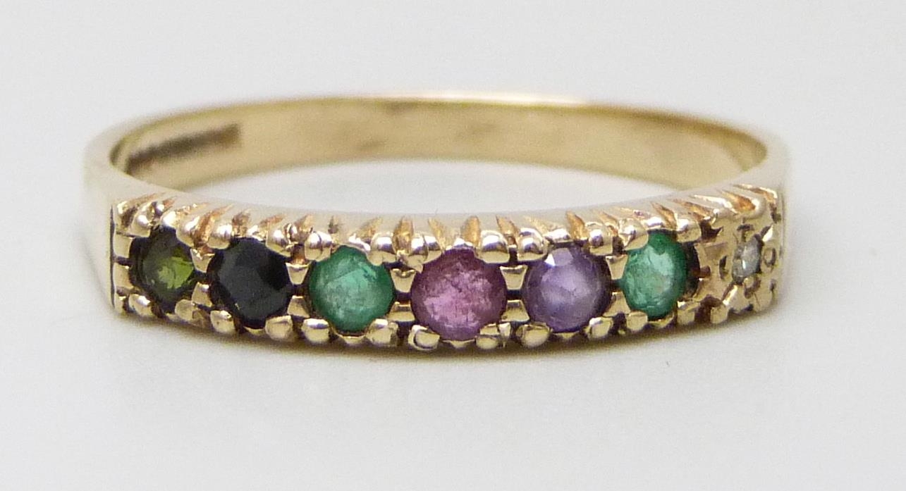 A 9ct gold 'dearest' gemstone set ring, 1.6g, N