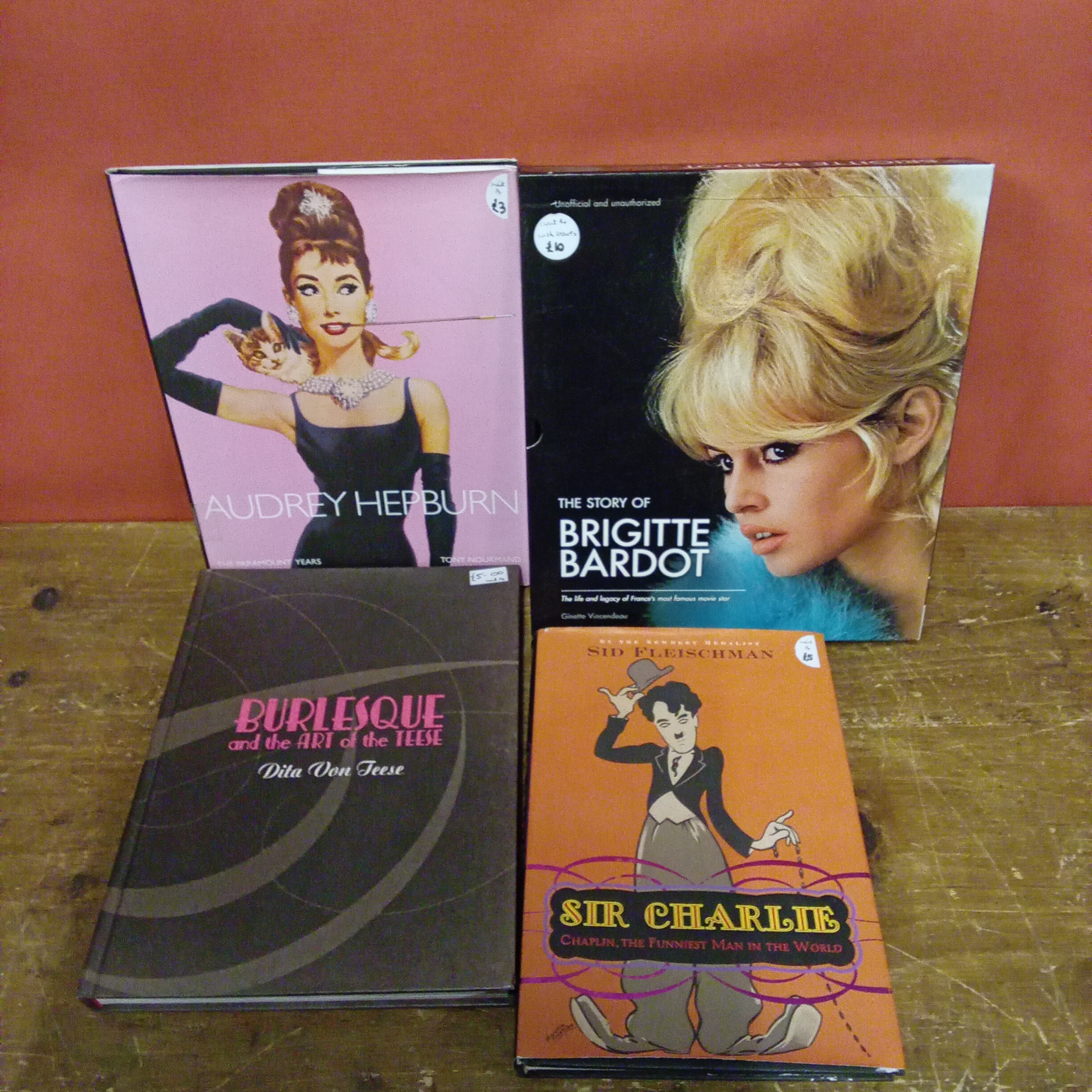 Mixed collection of books to include The story of Bridgette Bordot, Sir Charlie Chaplin, Audrey Hepburn and Burlesque.