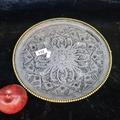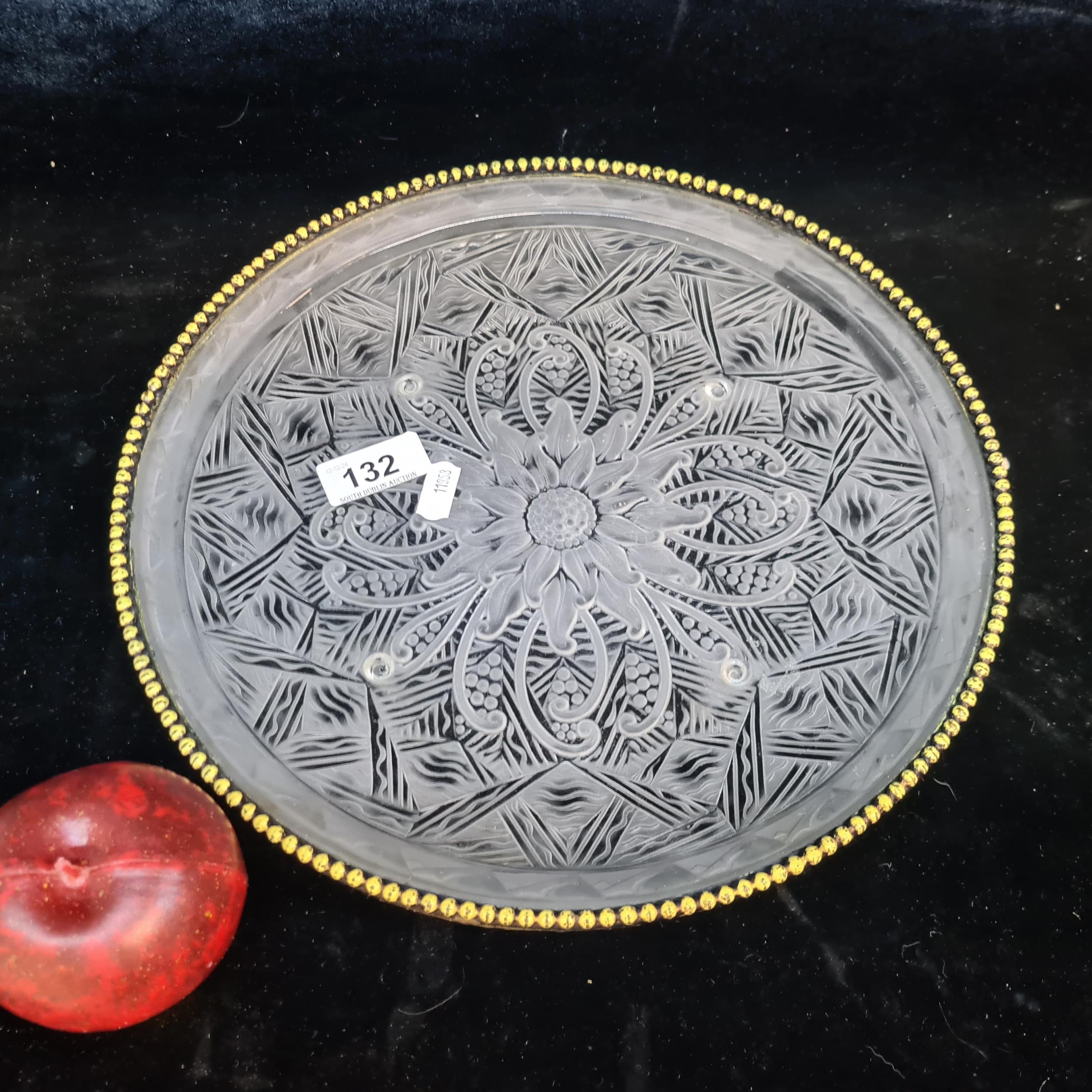 Star Lot : A large Lorrain Nancy France footed glass serving dish with a black and yellow painted rim, and floral decoration in relief to base.
