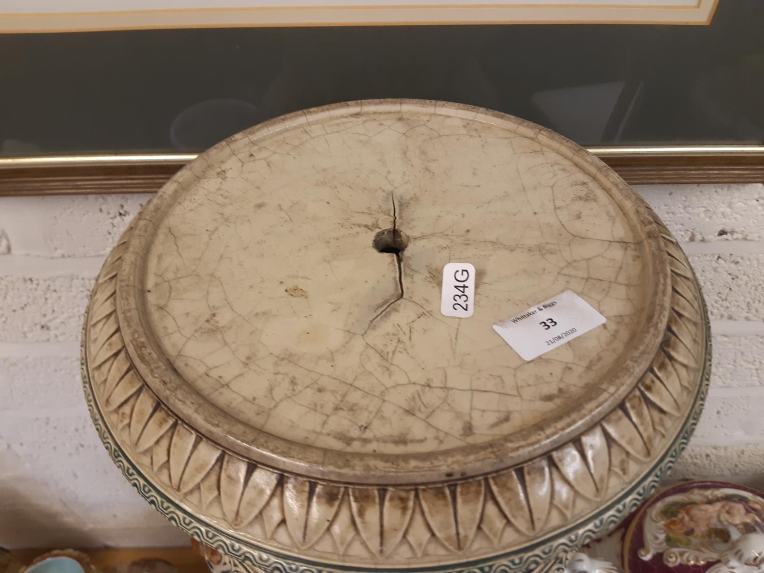 A heavy stoneware salt glazed English Majolica jardinière stand with lion head acanthus leaf and swag design in earthy tones with lady portrait head handles – measuring approx. 83cm in height