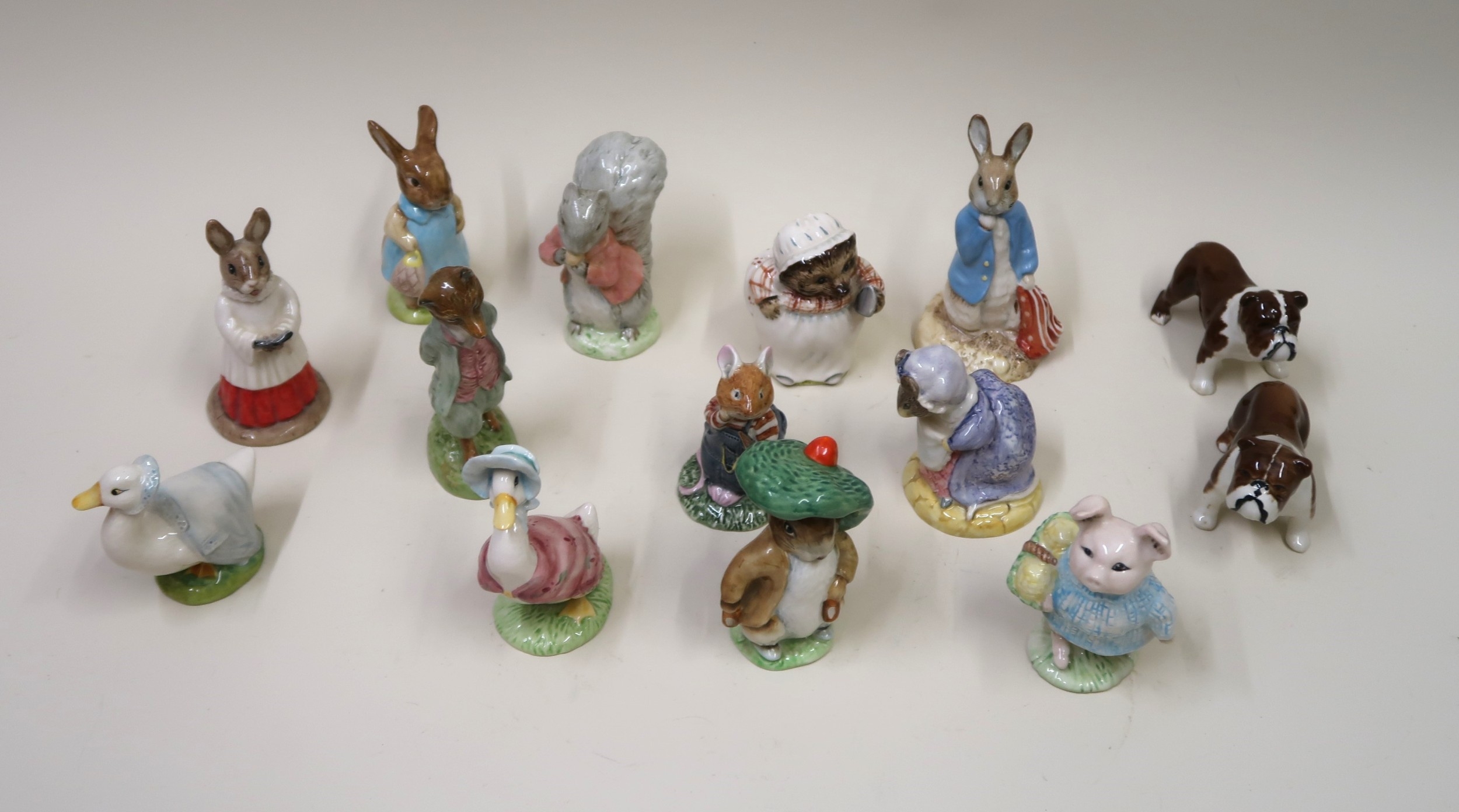 Group of twelve various Royal Doulton Bunnykins, Beswick and Royal Albert figures, including Beatrix Potter, together with two Beswick figures of bulldogs