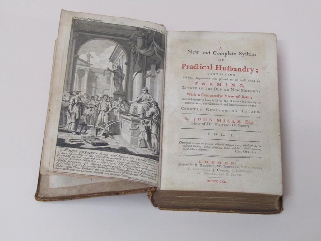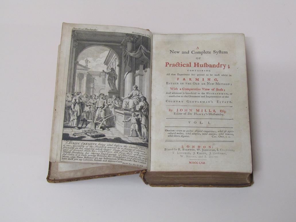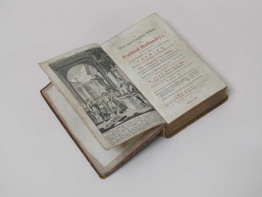 A Book - A New and Complete system of Practical Husbandry containing all that experienced has proved to be most useful in farming either in the old or new method, by John Mills, editor of Du Hamel's Husbandry, being volume I, printed London 1762, brown leather bound.