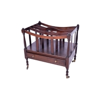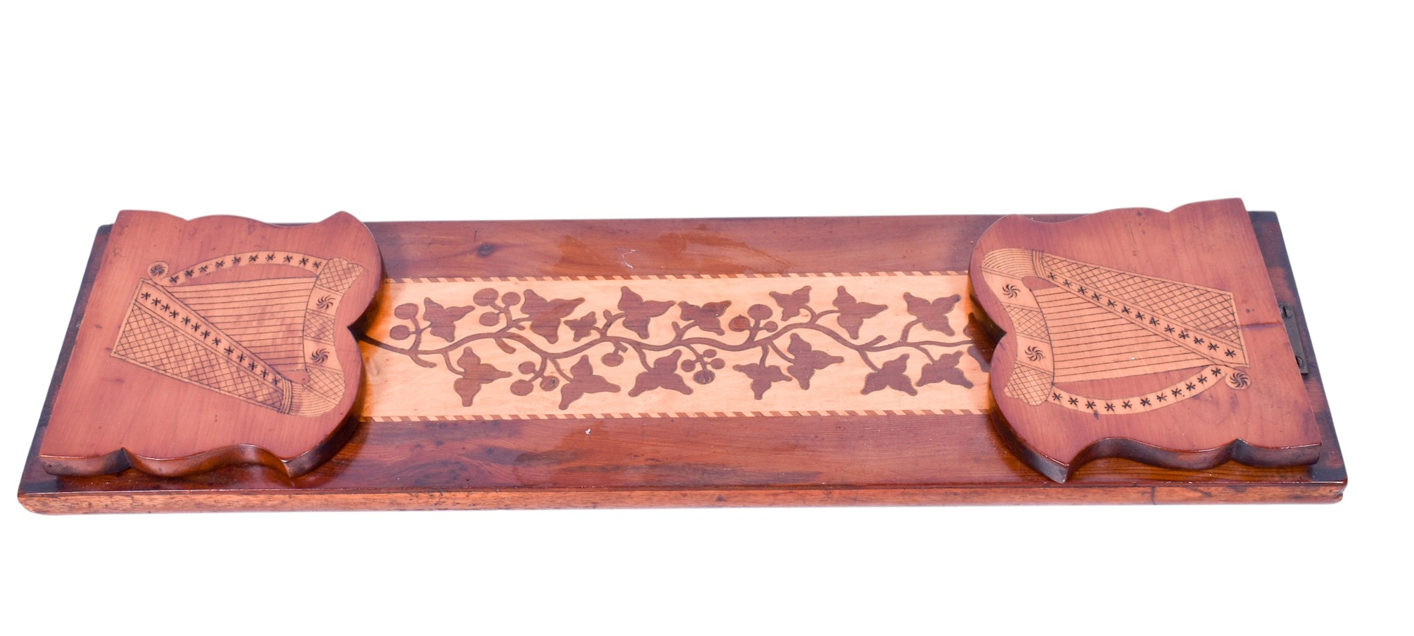A mahogany marquetry book trough, possibly Irish. Having folding ends with harp engraved decoration L41cm.