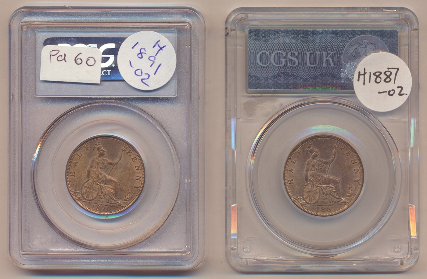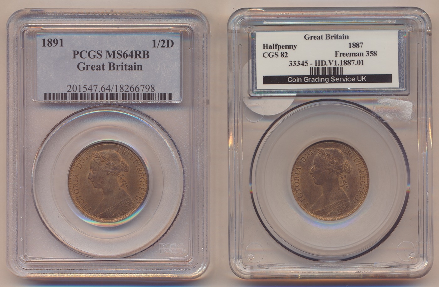 Collection of half pennies in plastic holders with PCGS 1891 MS64RB, NGC 1897 low sea level MS65RB, 1897 high sea level MS64RB, 1903 MS64RB, CGS UK 1887 CGS82 and 1904 CGS75. Qty 6 (R)
