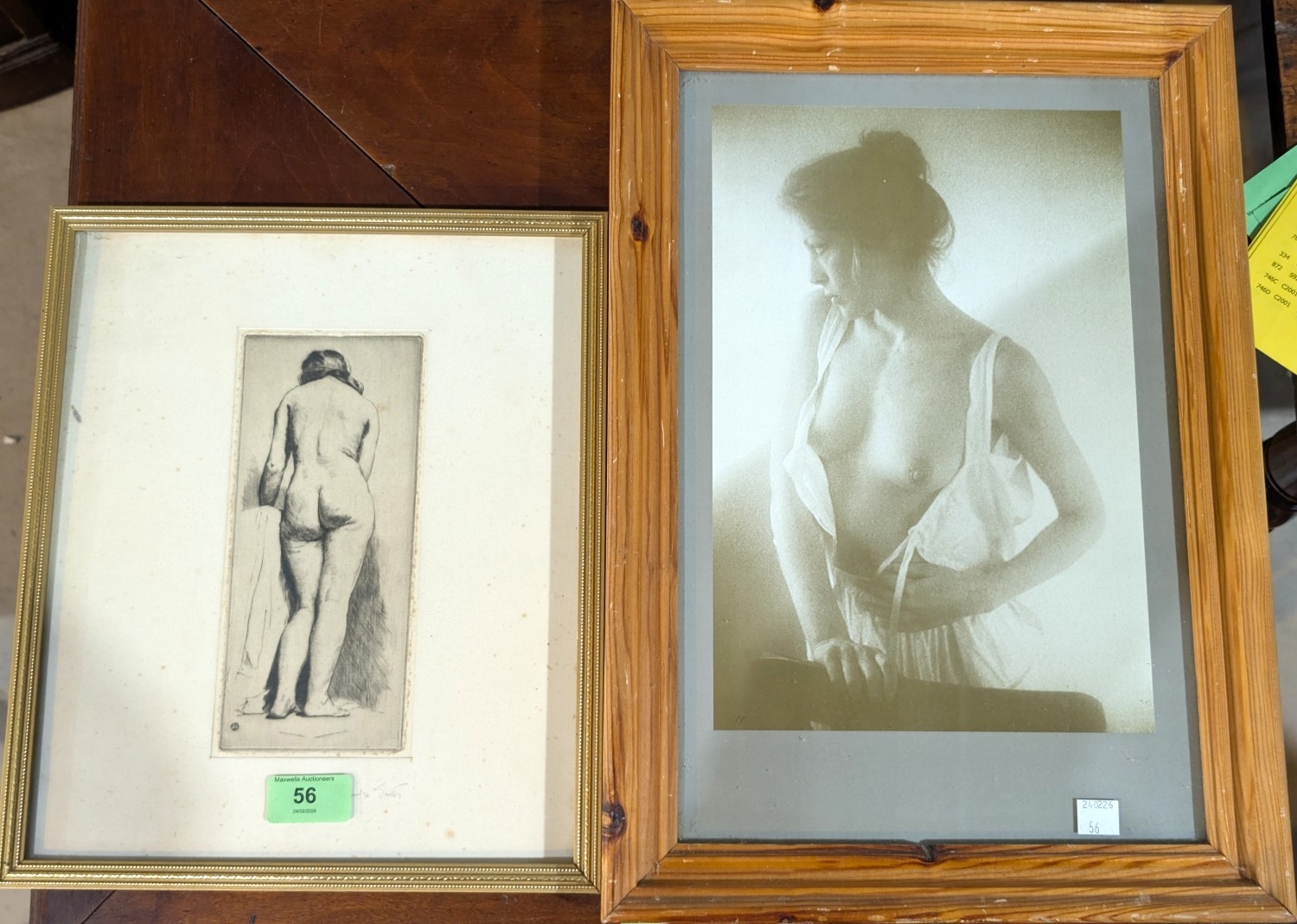 A 19th century pencil signed nude etching of a female from behind, C. Smith and a black and white boudoir photograph plus others.