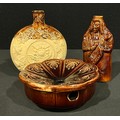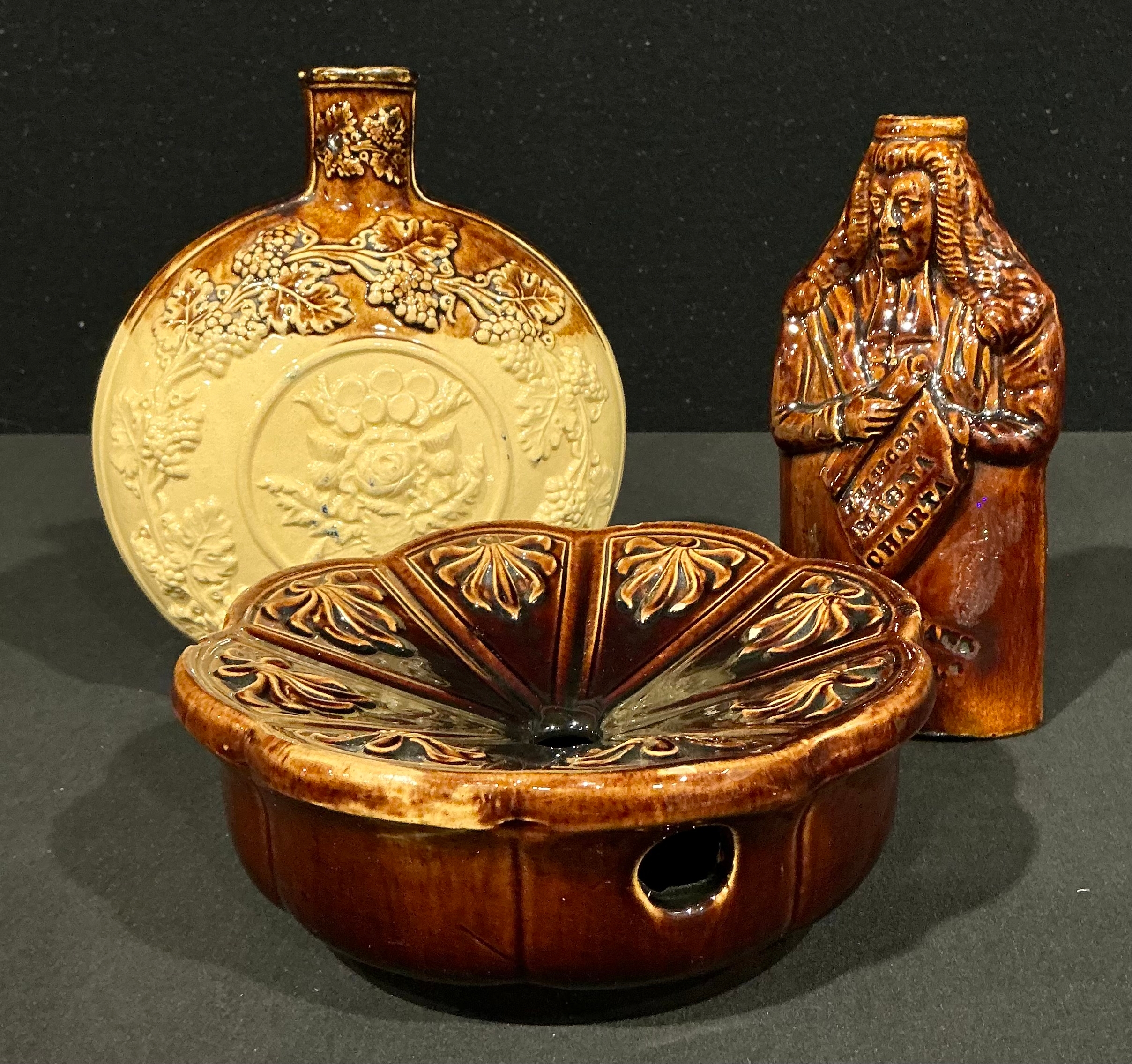 A Joseph Thompson Hartshorne Pottery (Derbyshire, 19th century) salt glazed stoneware reform flask, Brougham Reform Cordial, modelled as the Lord High Chancellor Brougham, treacle glazed, 17cm, impressed marks, c.1832; a Thompson Brothers, Hartshorne Pottery salt glaze stoneware spittoon, 17cm wide, impressed marks, lozenge registration mark, dated 1862; a Thompson Brothers similar sprigged moonflask, 19.5cm, impressed mark (3)