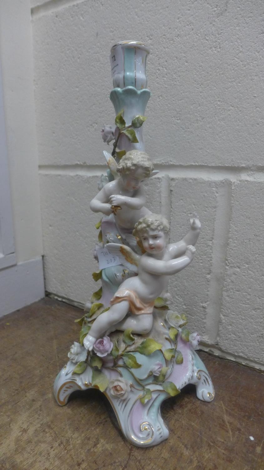 A German porcelain cherub candlestick, 36cm