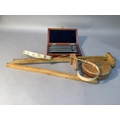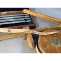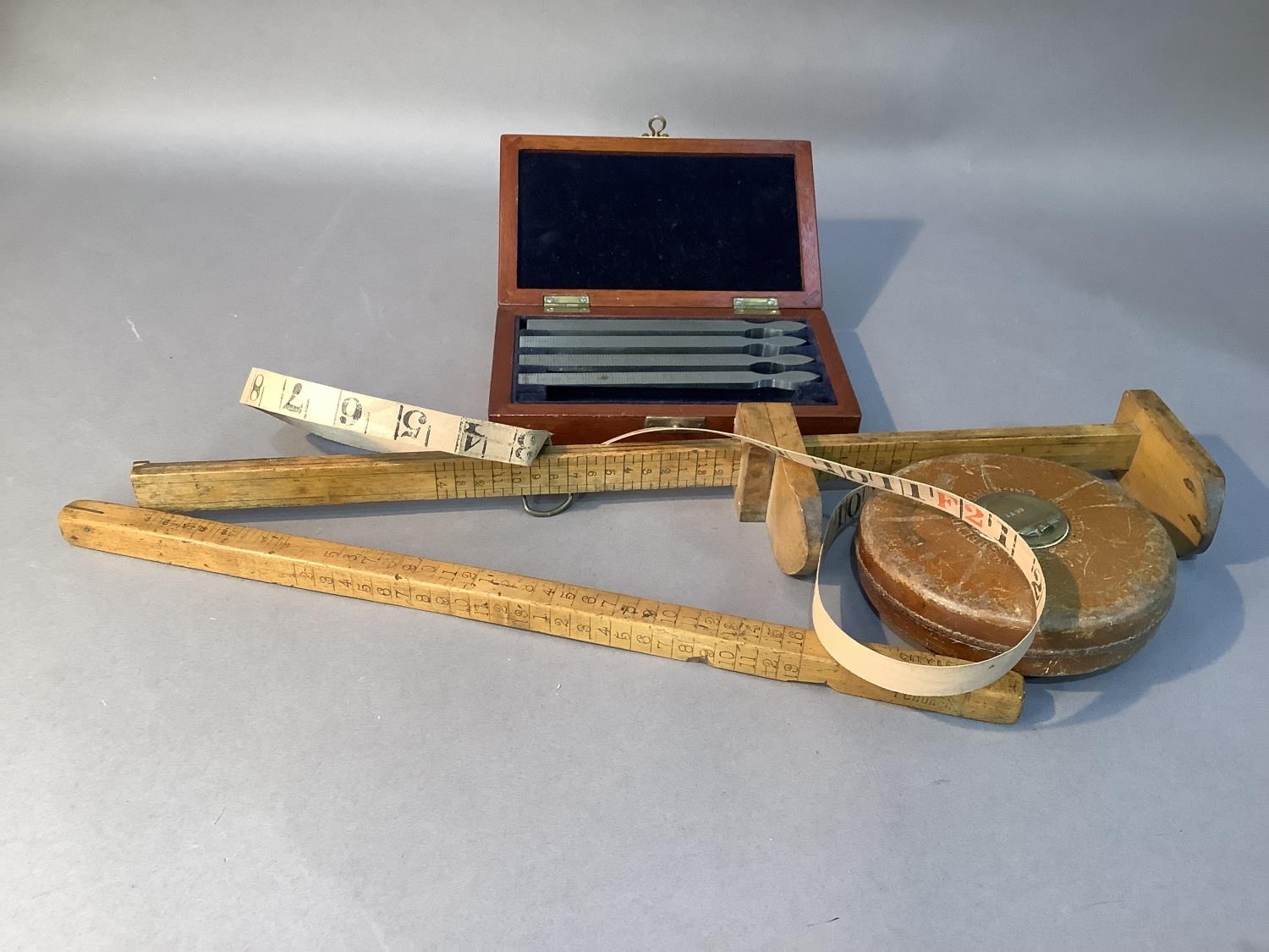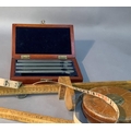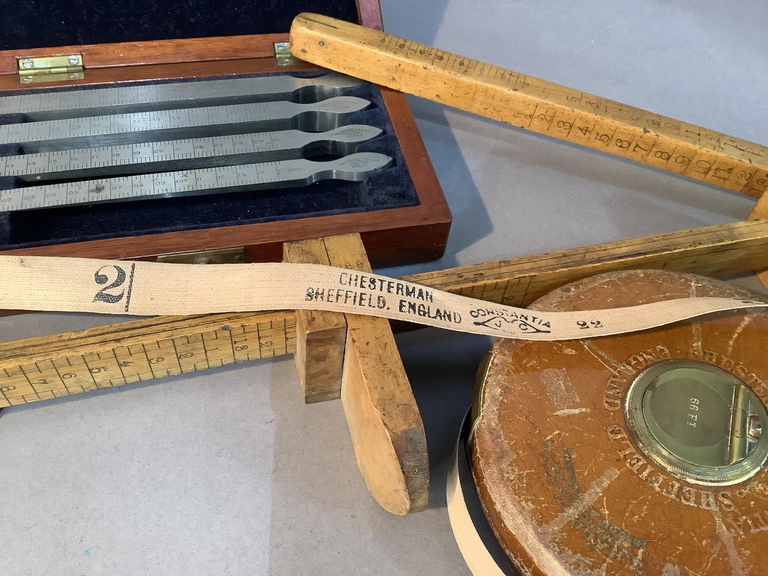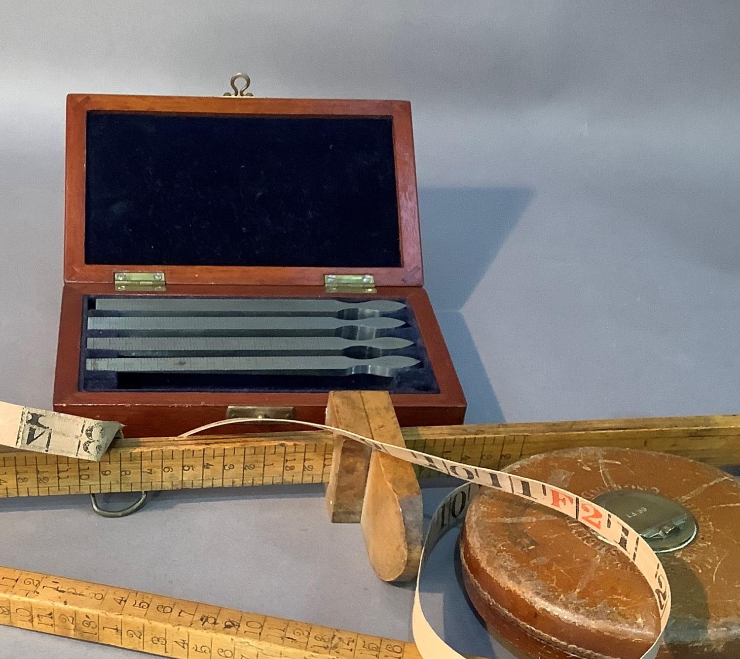 A leather bound tape measure, 66ft by Halden and Co Manchester, a boxwood hemline measure, a 16 inch rule of square section and a mahogany case of fine chisels, one missing
