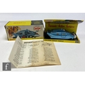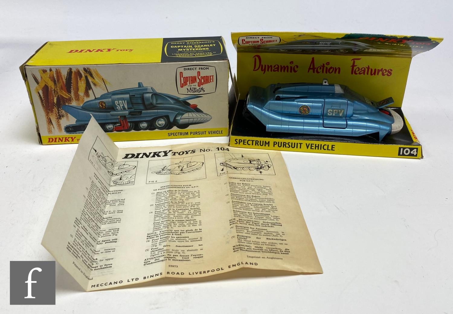 A Dinky Toys No. 104 Gerry Anderson's Captain Scarlet and the Mysterons Spectrum Pursuit Vehicle diecast model, blue, white bumper, cast hubs, black aerials and rubber tracks with white and red missile, on inner pictorial stand in picture box with instruction leaflet.