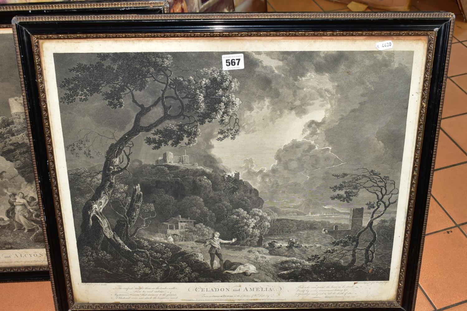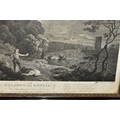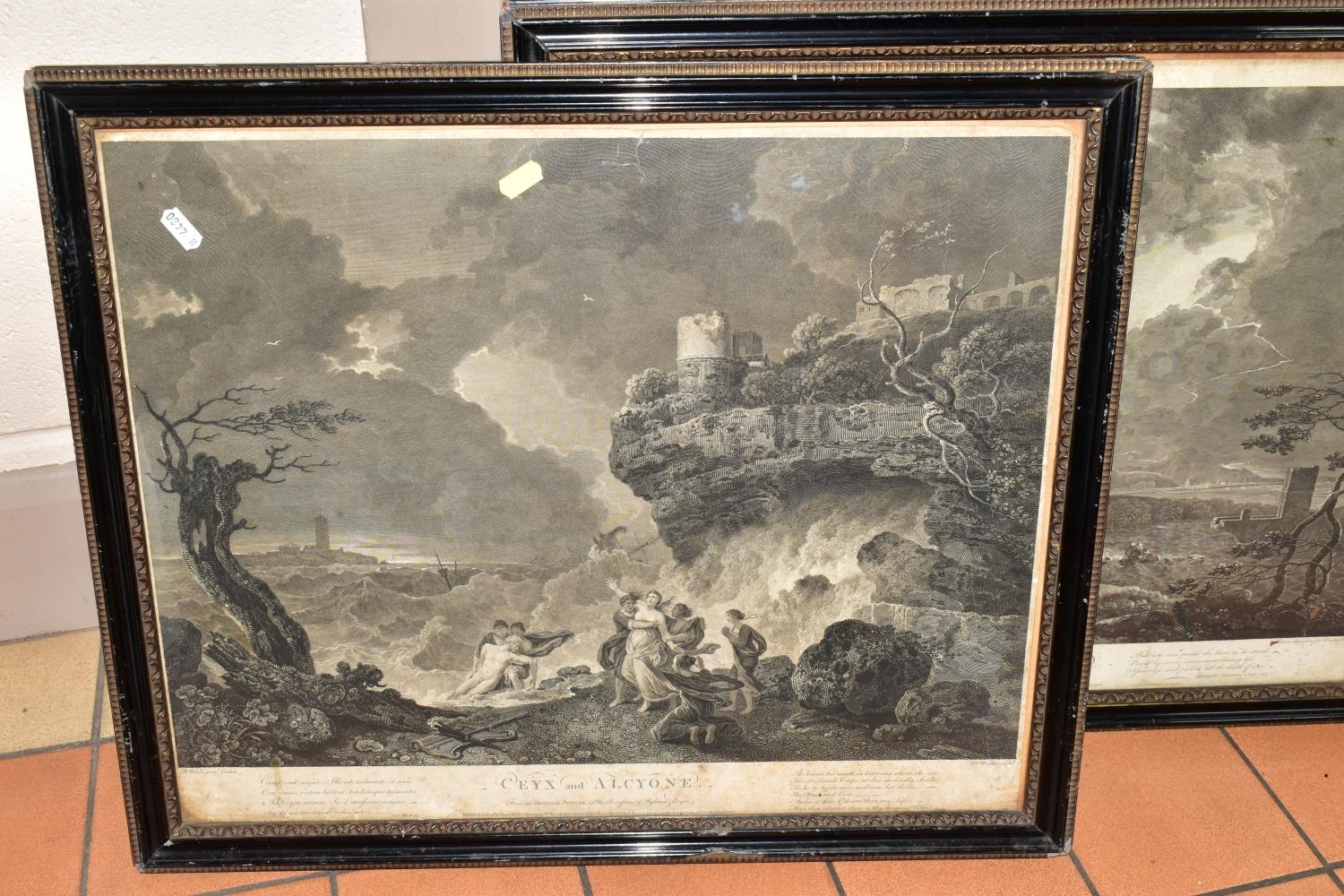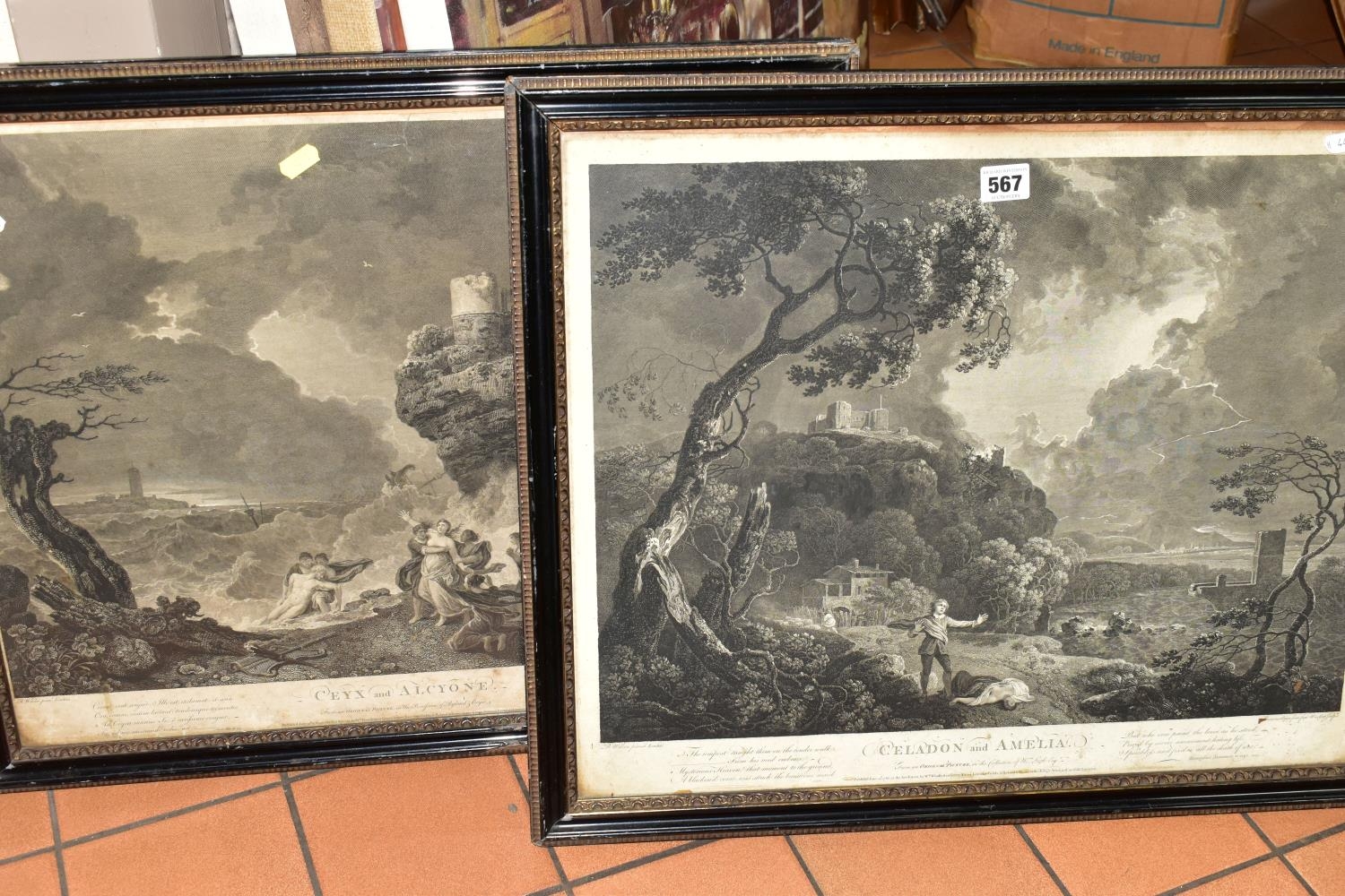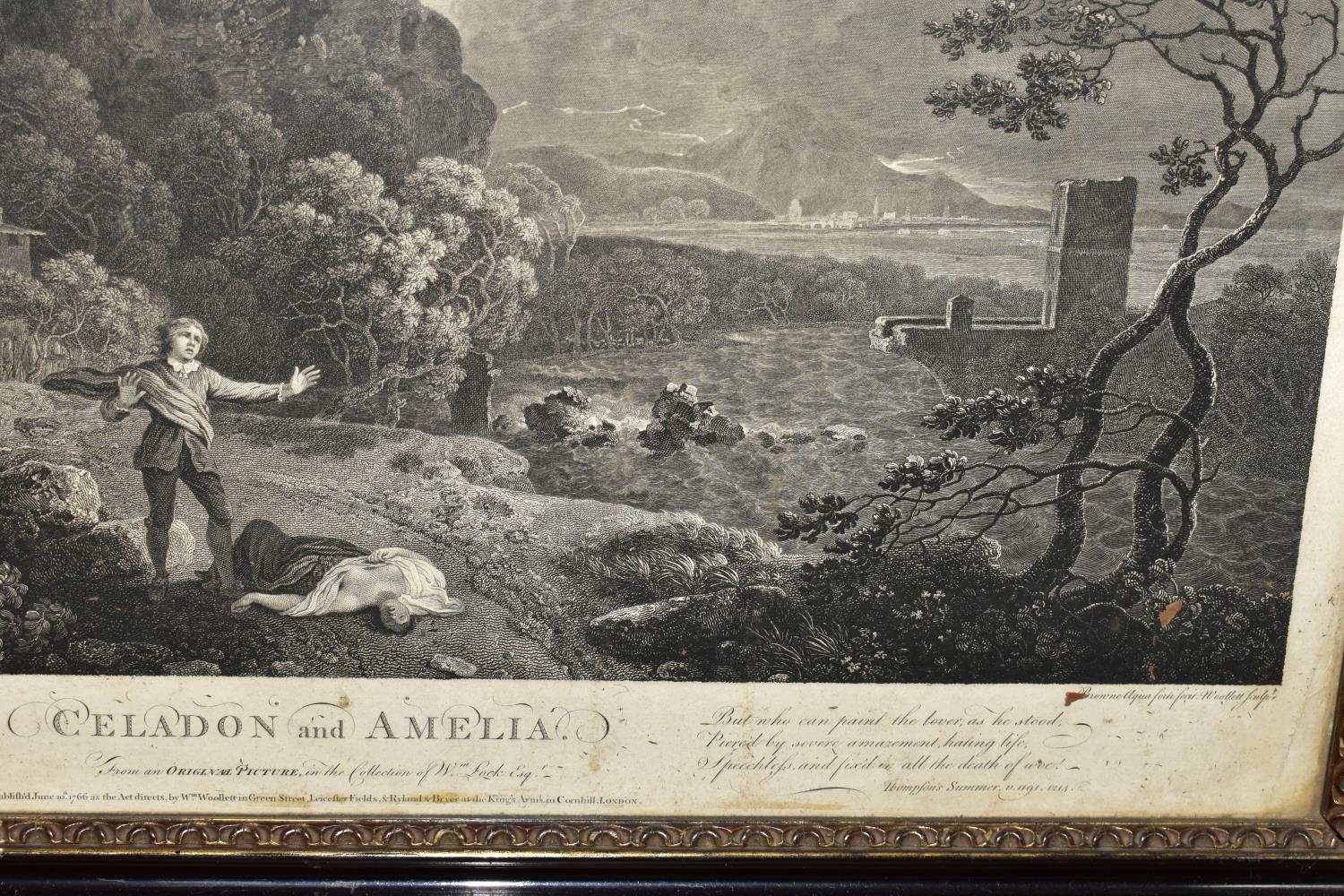TWO EIGHTEENTH CENTURY ENGRAVING PRINTS BY WILLIAM WOOLLETT, comprising 'Celadon and Amelia' after the painting by Richard Wilson, published 1766 and 'Ceyx and Alcyone' also after Richard Wilson published 1769, approximate sizes 44cm x 54cm, Condition: tear to the top of the Ceyx print, both with some staining, frames damaged