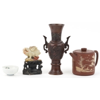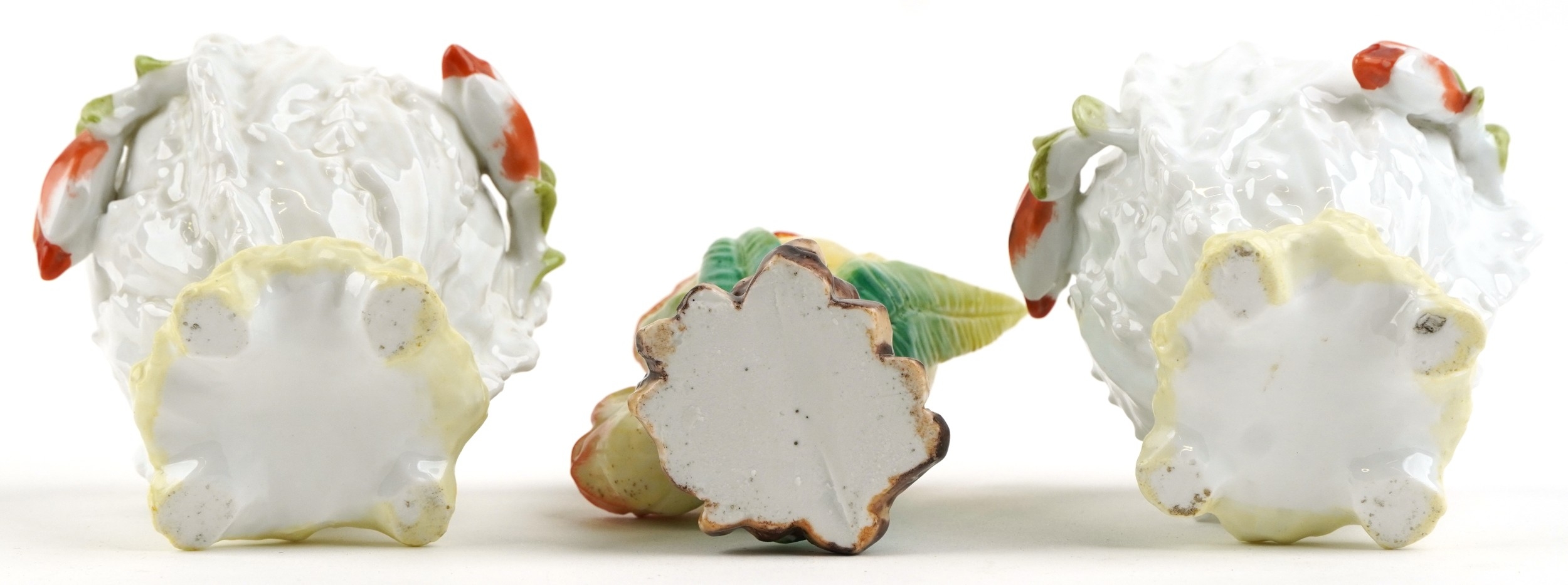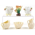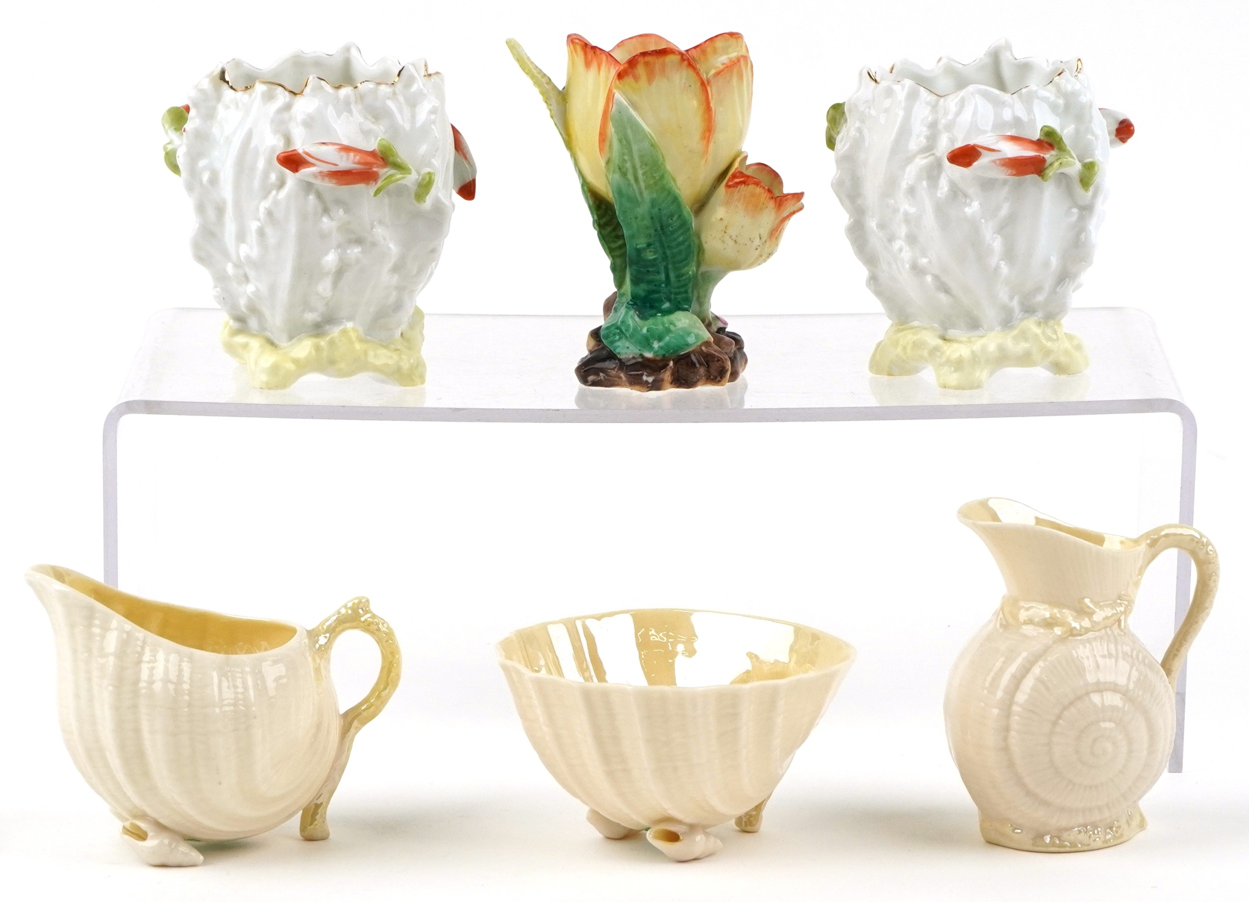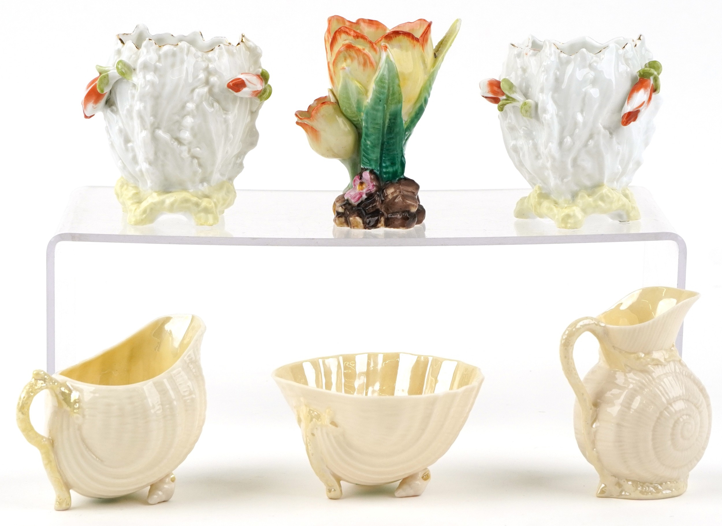 20th century China comprising Belleek shell design porcelain and three floral spill vases, the largest 9.5cm high.
