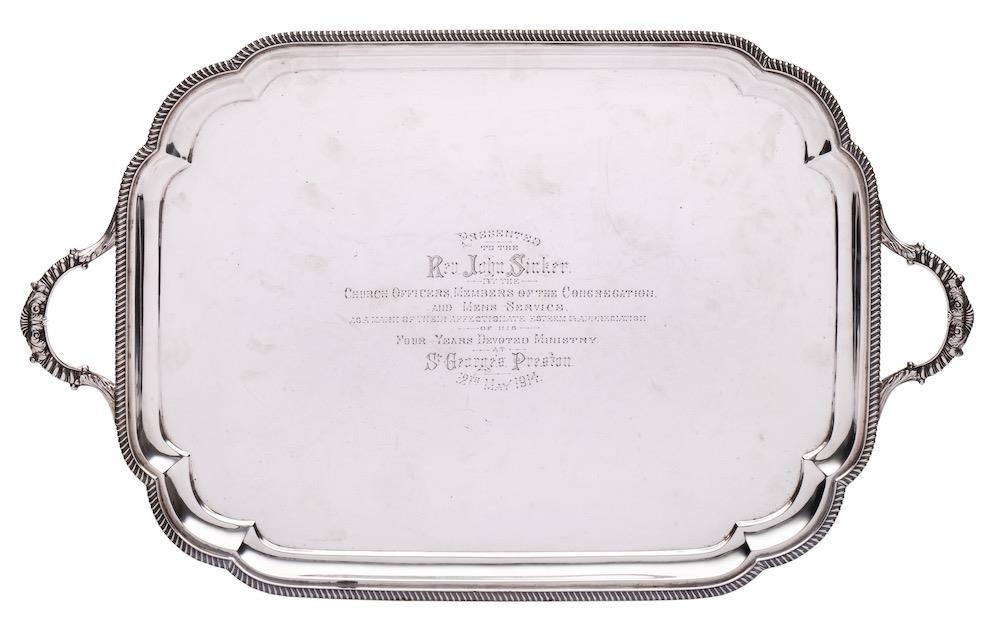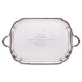A George V silver serving tray, maker John Hunt, London, 1913: inscribed, of plain rectangular outline with gadrooned border and scroll decorated loop handles to the sides, 62cm wide, 2421gms, 77.84ozs.