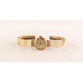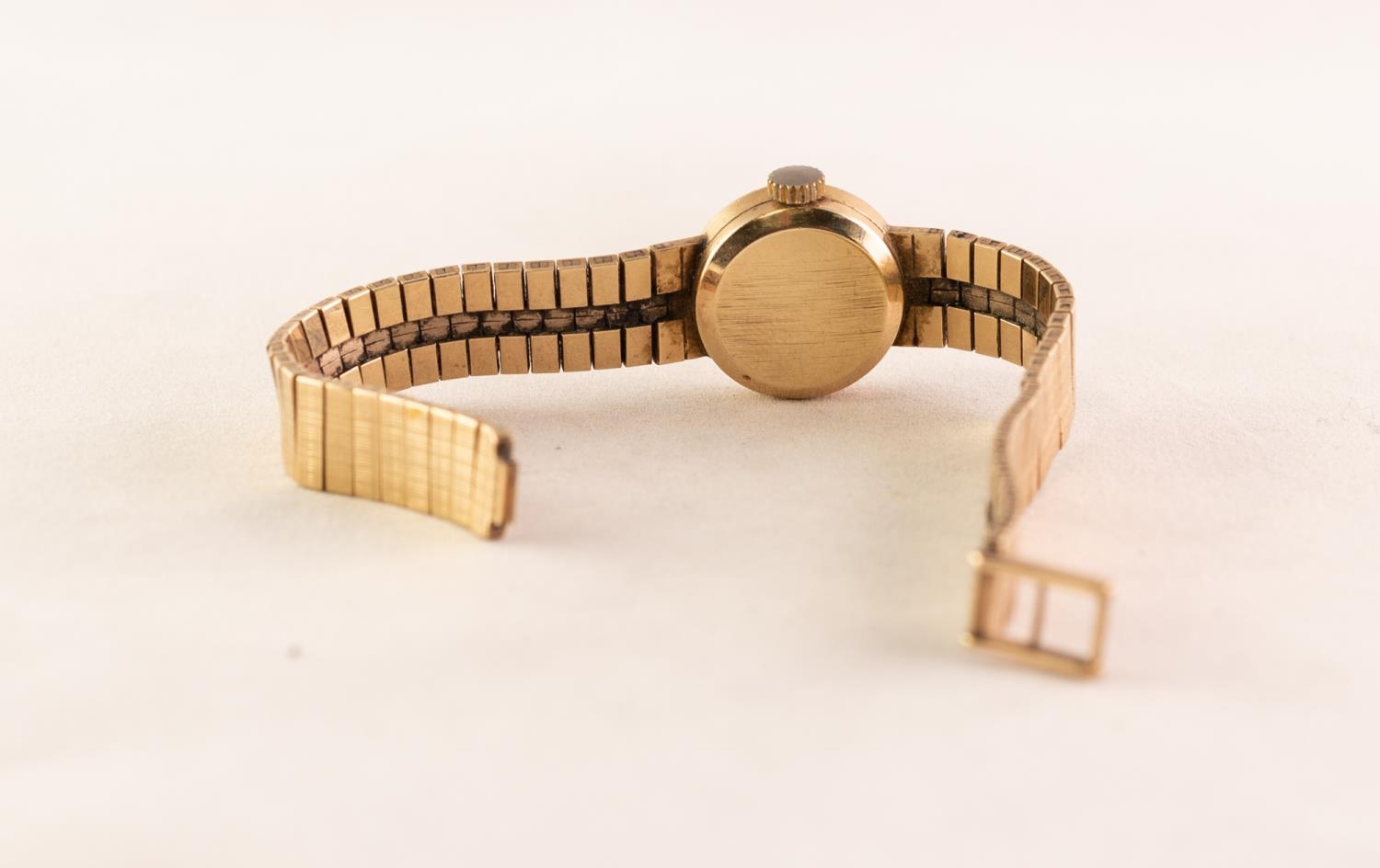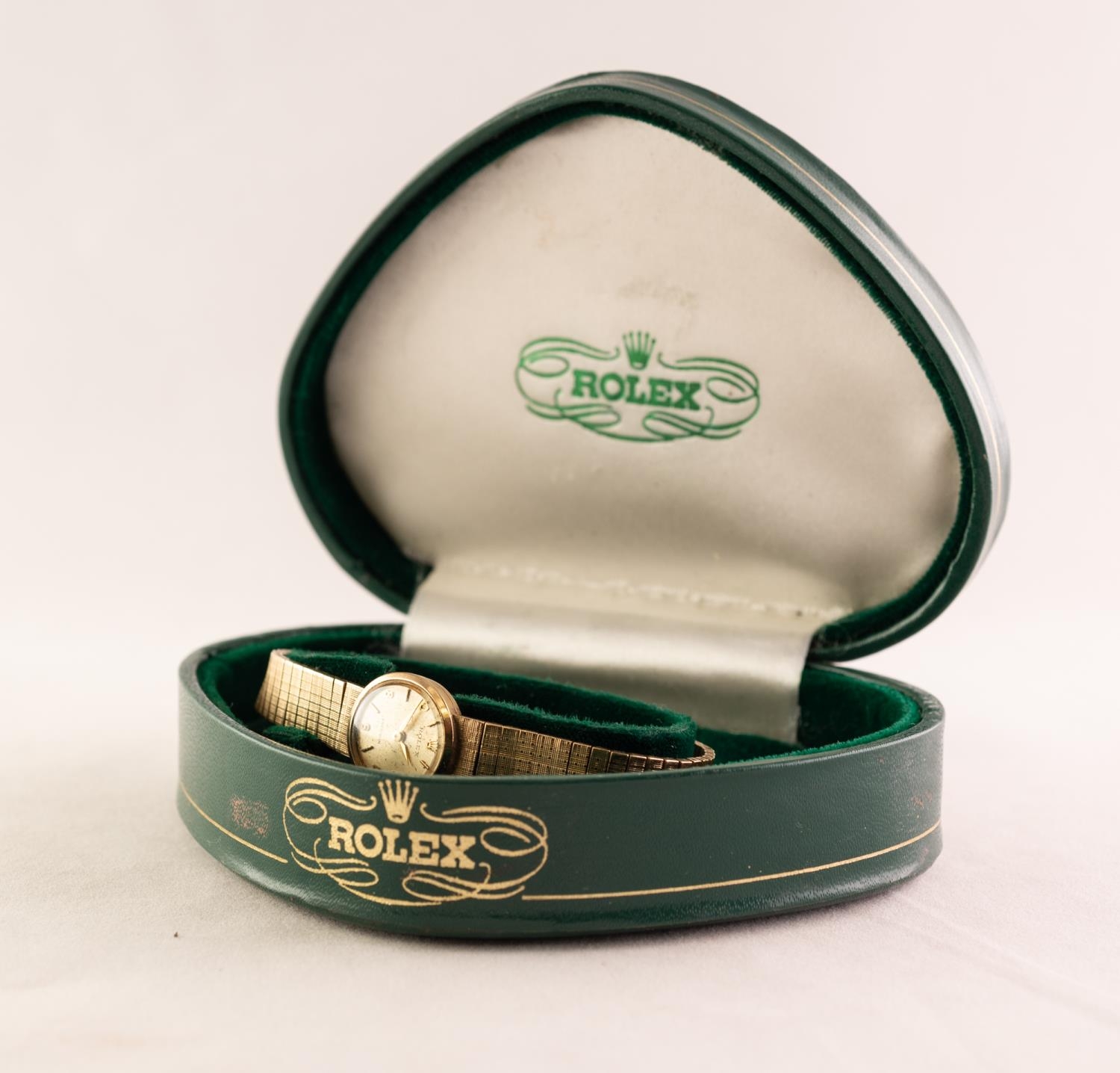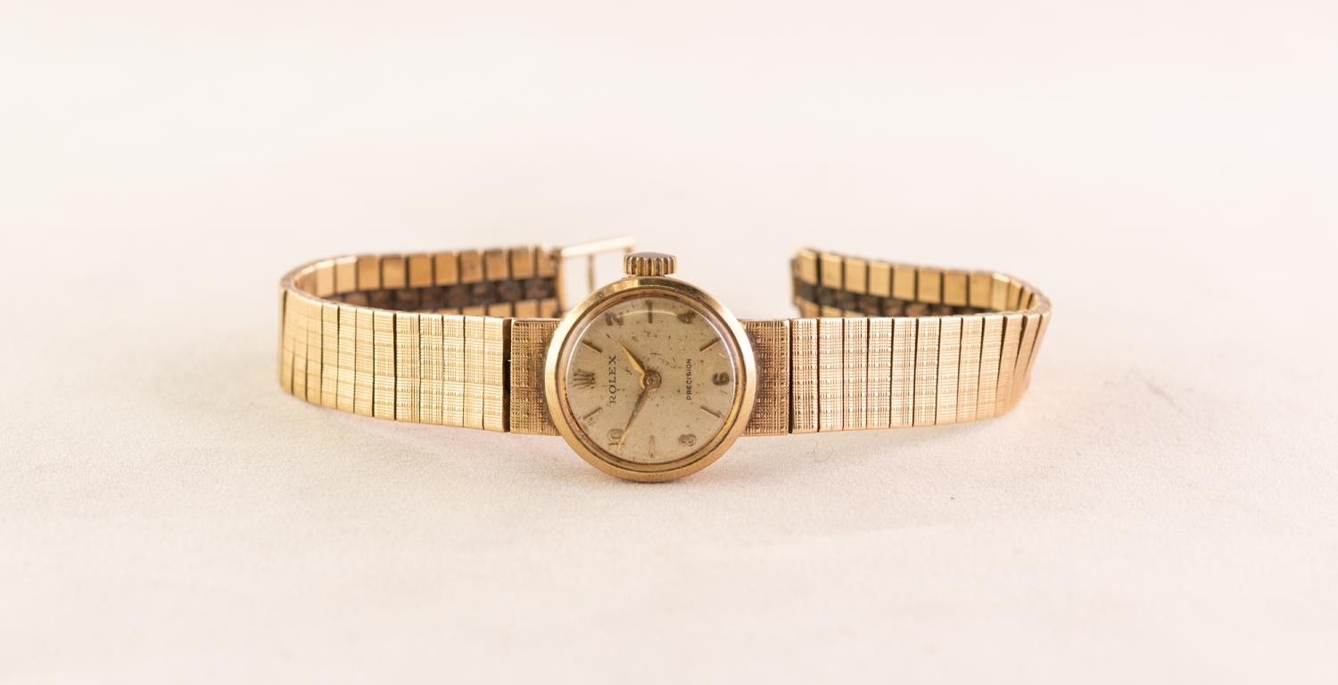 LADY'S ROLEX 'PRECISION' 9ct GOLD WRISTWATCH with manual 18 rubies movement, the small silvered circular dial with five arabic numerals and batons , 5/8in (1.5cm) diameter, INTEGRAL 9ct GOLD FLEXIBLE BRACELET, London hallmark 1964, 19gms gold weight, in Rolex heart-shaped case (c/r working but clasp missing from the bracelet)