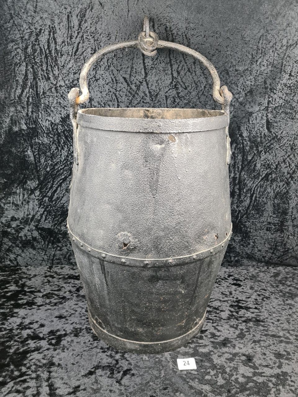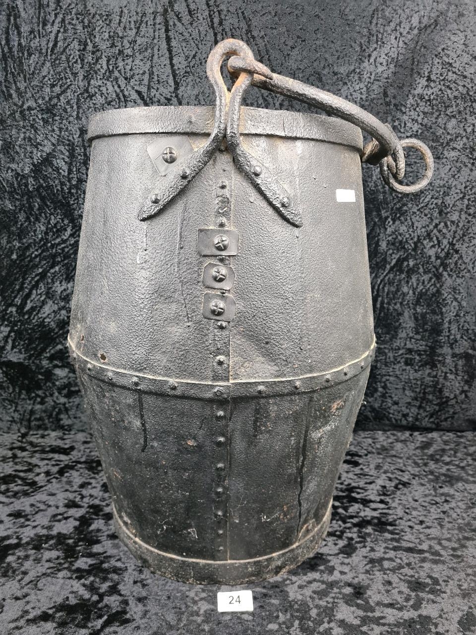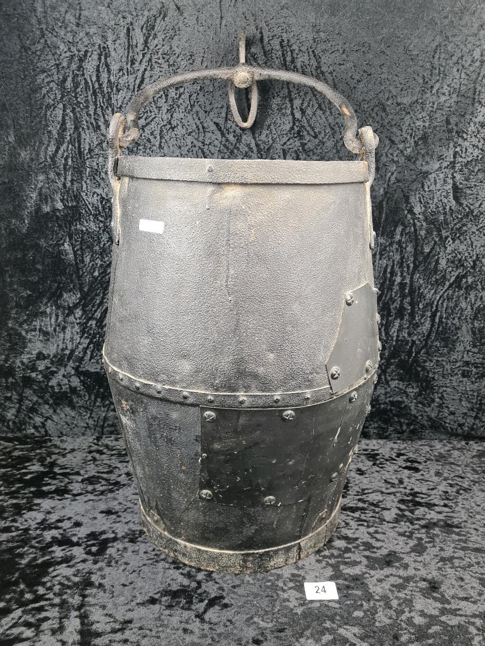 19th-century English well bucket - designed with a tapered shape to tip forward and fill with water when landing and has a bail and hanger loop for lifting. Approx H52cm.