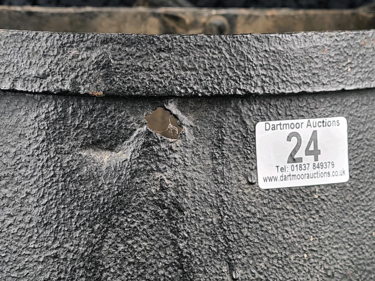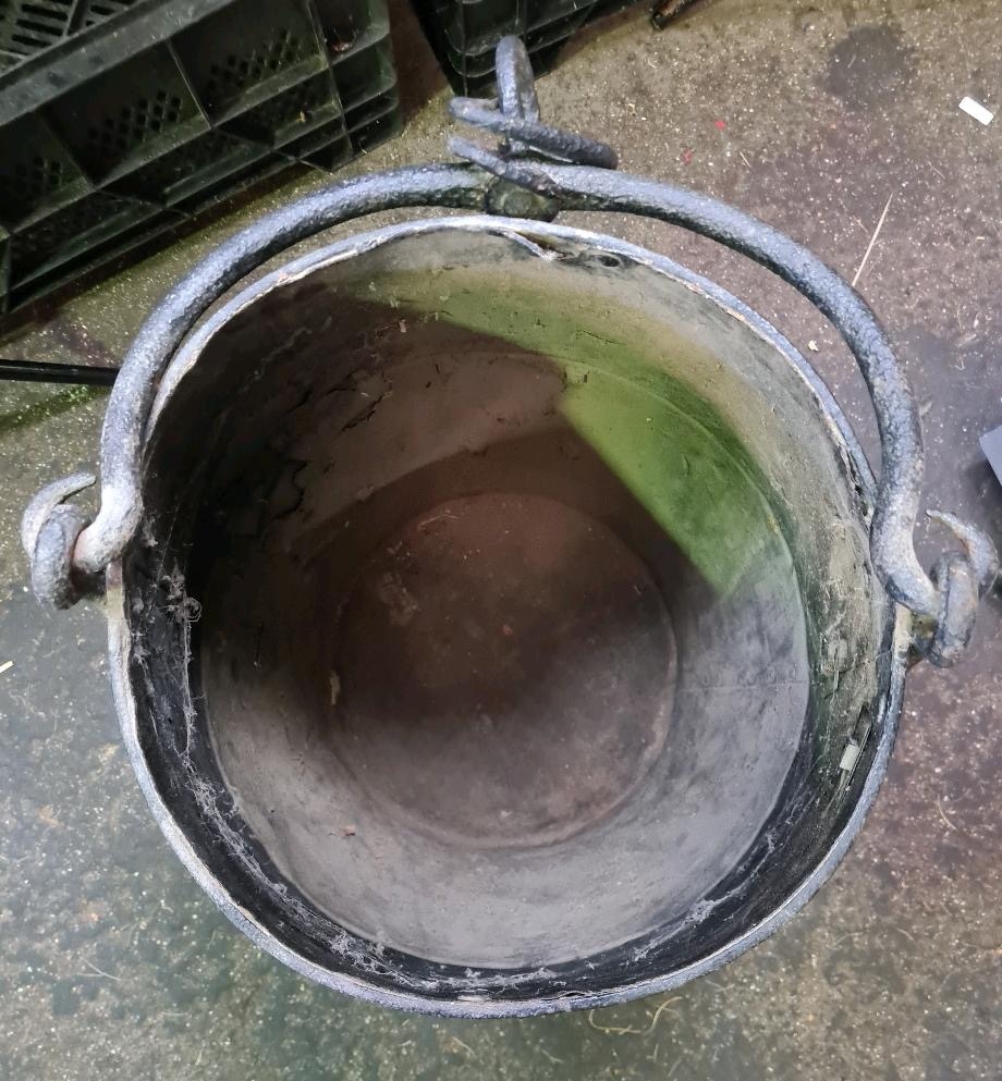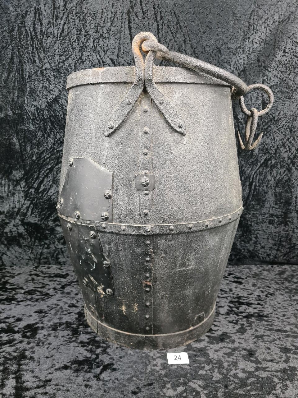 19th-century English well bucket - designed with a tapered shape to tip forward and fill with water when landing and has a bail and hanger loop for lifting. Approx H52cm.