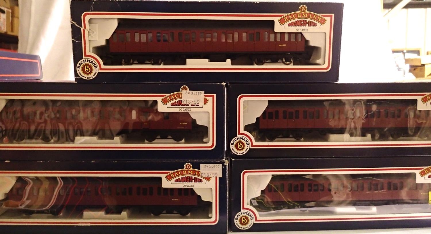 OO scale Bachmann Suburban coaches x5, Crimson 34-600 x2, 34-605, 34-625 and 34-676, mostly in very good condition, boxes are fair. P&P Group 1 (£14+VAT for the first lot and £1+VAT for subsequent lots)