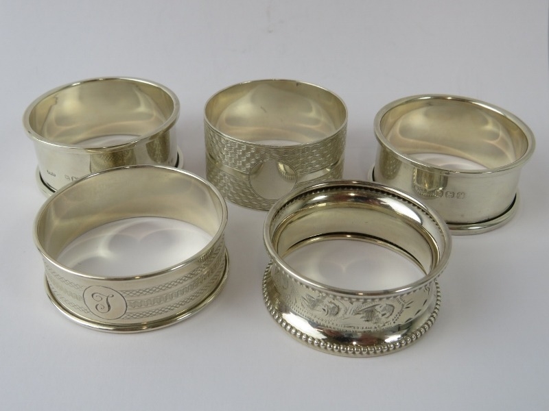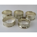 Five mixed silver napkin rings, all fully hallmarked. Gross weight 64 grams.