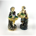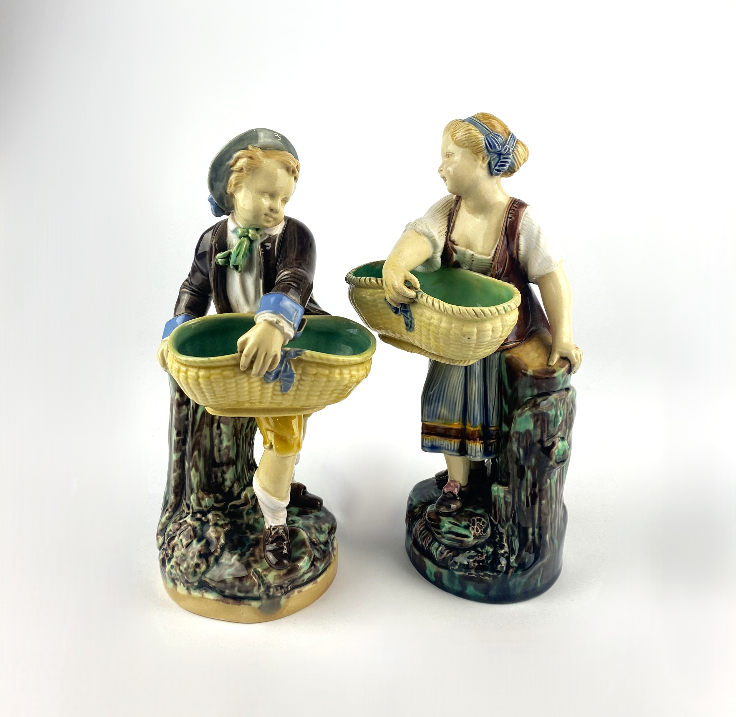 A pair of Minton majolica figural salts modelled as a girl and a boy carrying baskets 21cm high