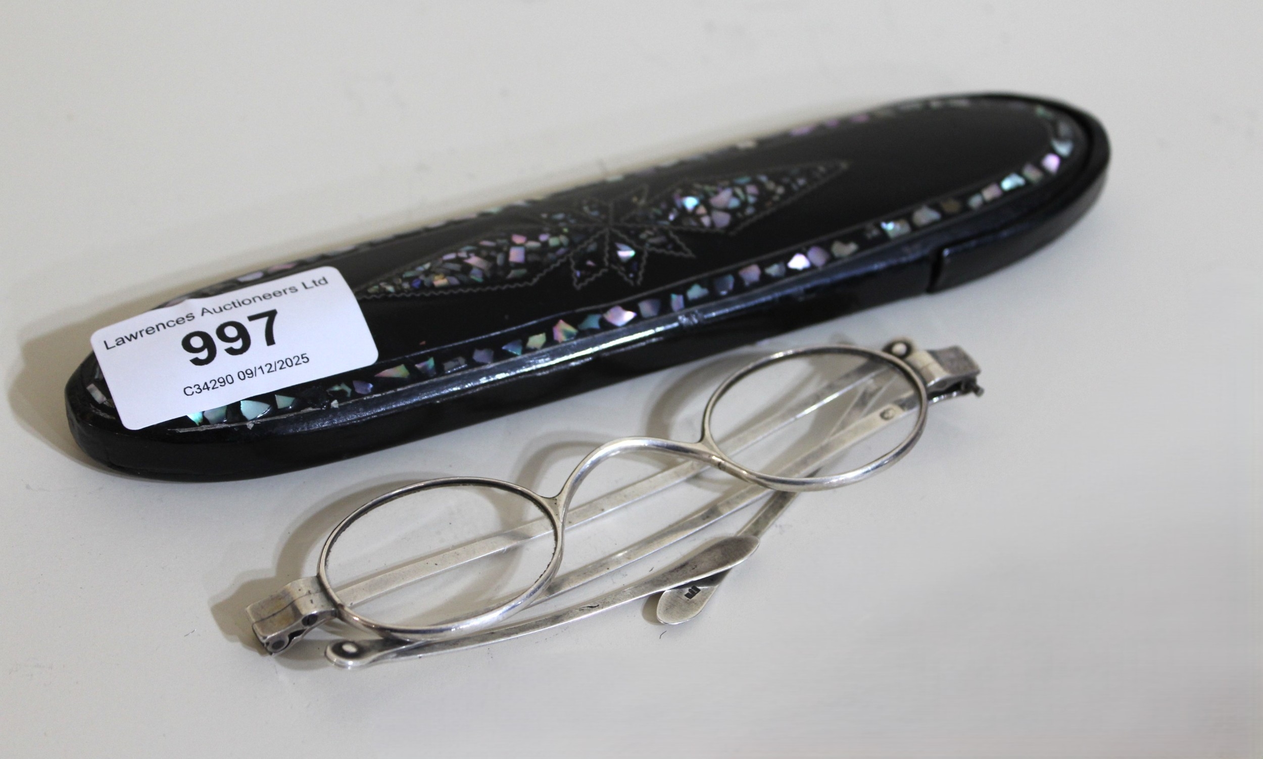Pair of 19th Century Irish silver spectacles in a mother of pearl inlaid and black lacquered papier mache case