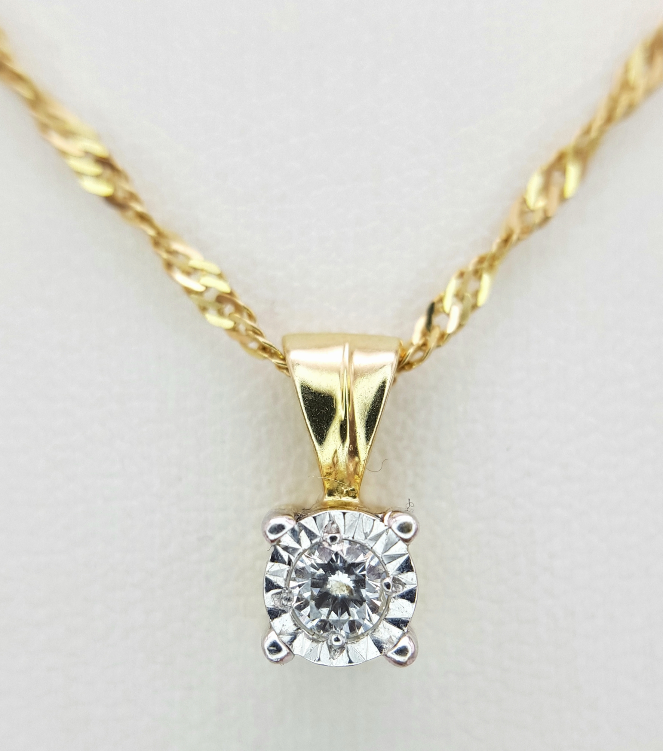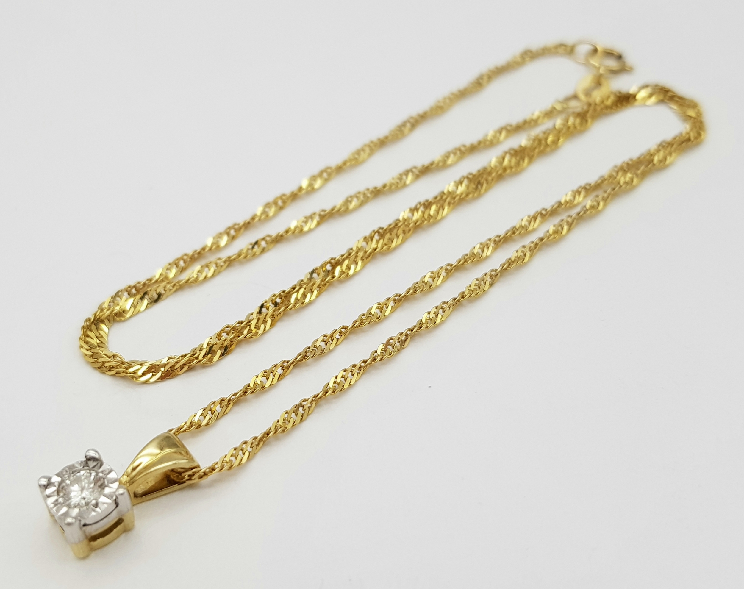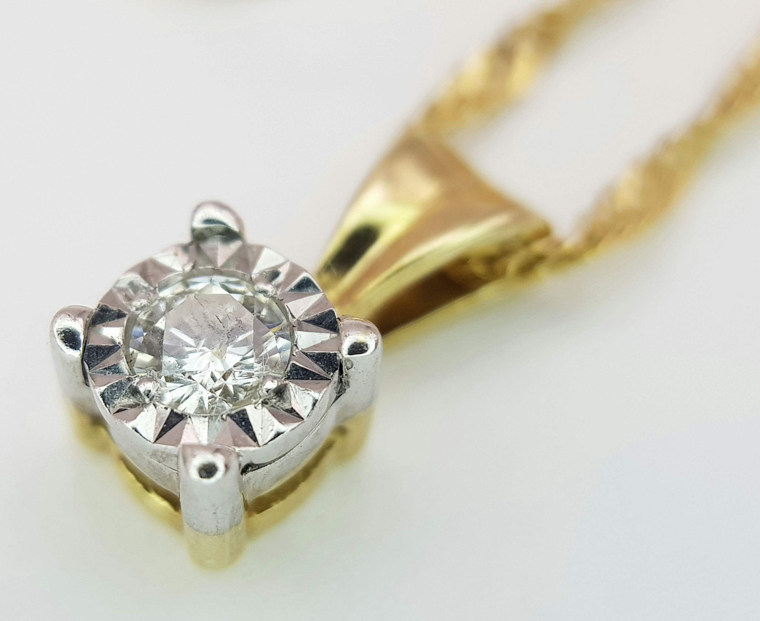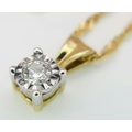 A 9K Gold and Diamond Pendant on an 18K Gold Yellow Chain. Round brilliant cut diamond - 0.15ct. 1cm and 44cm. 2.7g total weight. Ref: 27/8905.