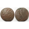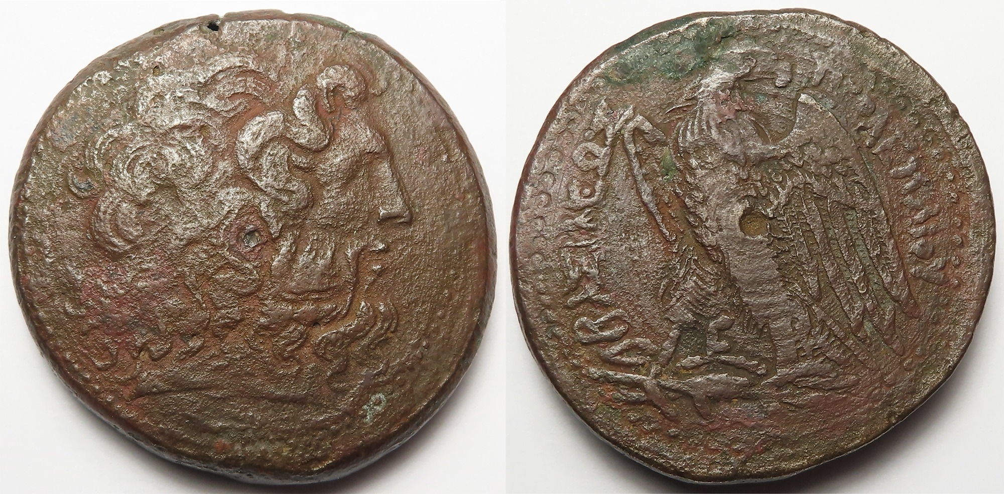 Ancient Greek: Ptolemaic Egypt, Ptolemy III Euergetes, 246-222 BC, AE Oktobol 46mm, 94.0g, Alexandria mint. Diademed head of Zeus-Ammon right. / Eagle with open wings standing left on thunderbolt, head to right, E between legs. SNG Copenhagen 142. Some porosity, GF, with some pitting and infill in the top edge.