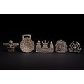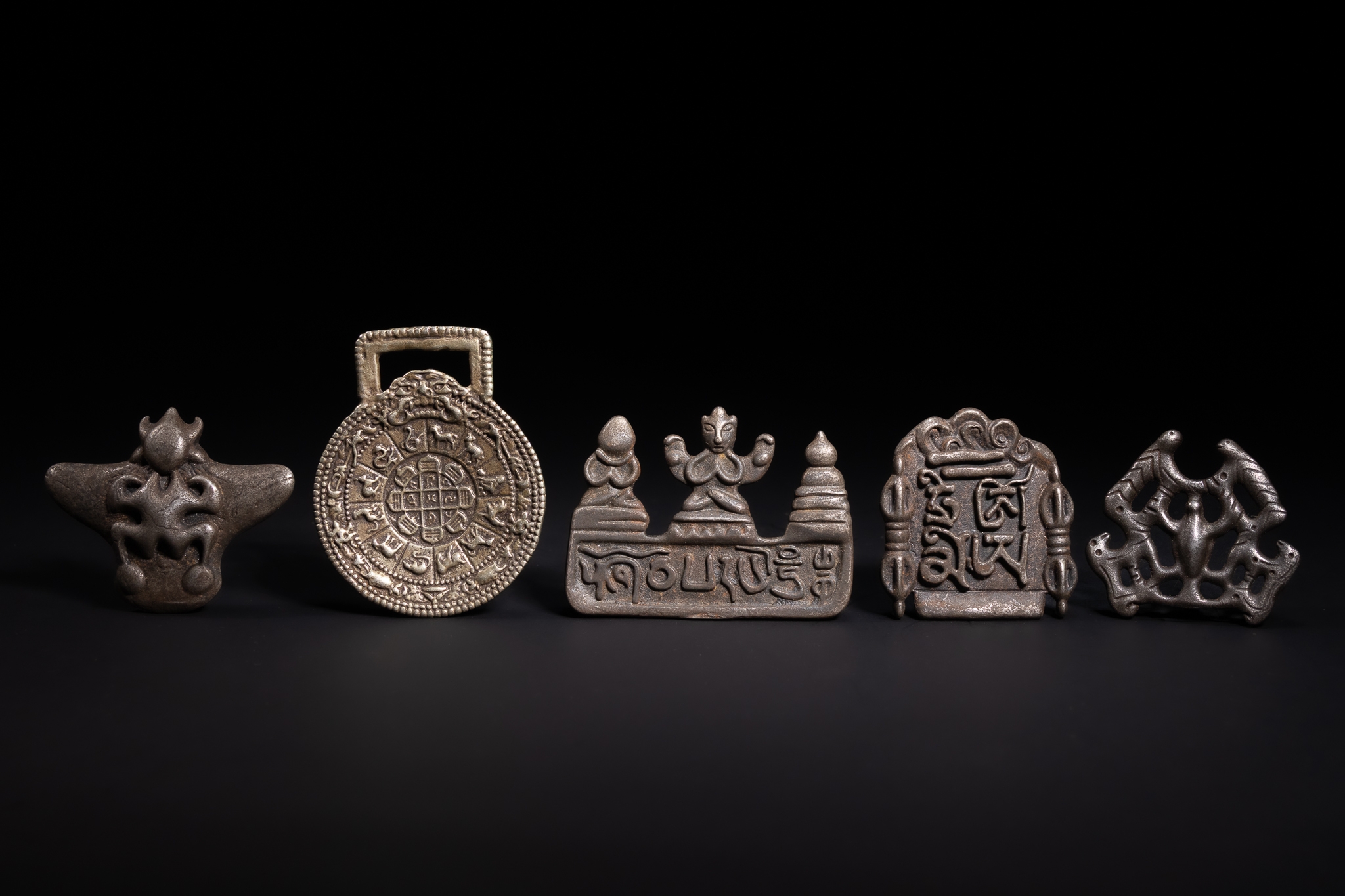 A group of Tibetan white metal amulets and plaques, each cast in relief with distinctive forms and symbolic motifs. The collection includes a round medallion with concentric decorative borders and central geometric elements, architectural-shaped plaques with raised script and seated figures, and openwork and sculptural pieces featuring stylised faces and abstracted animal forms.