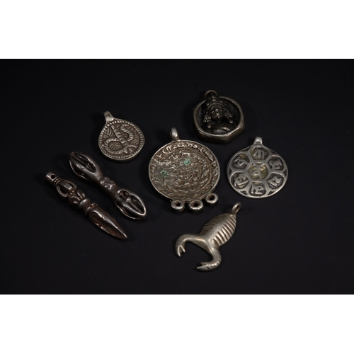 A Collection of Tibetan White Metal Amulets and Plaques.