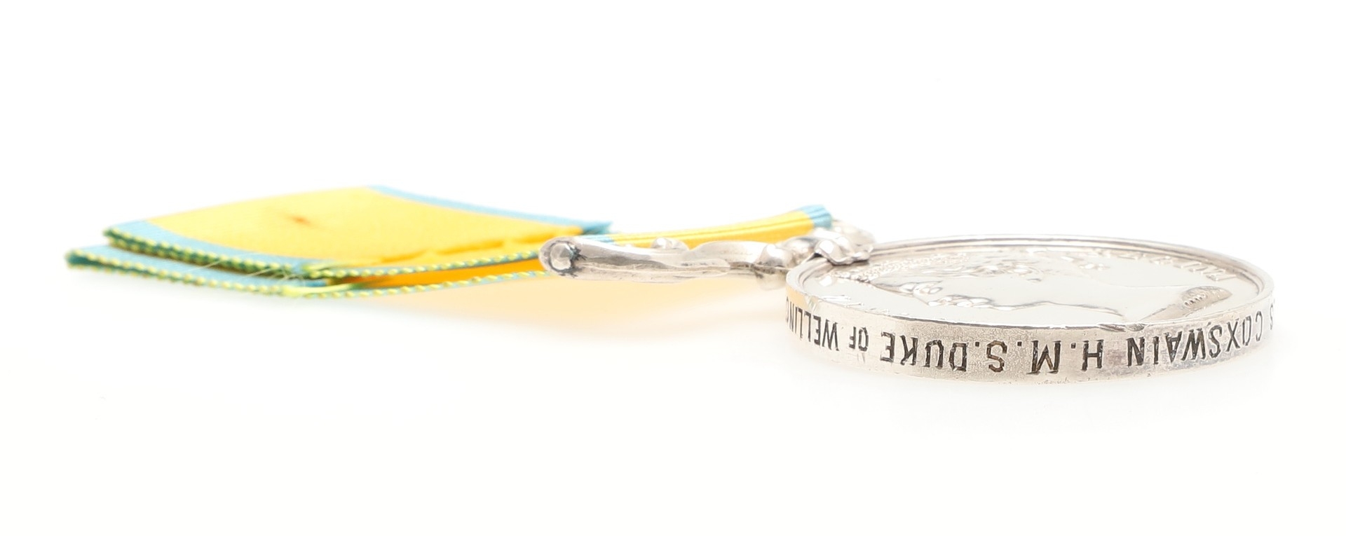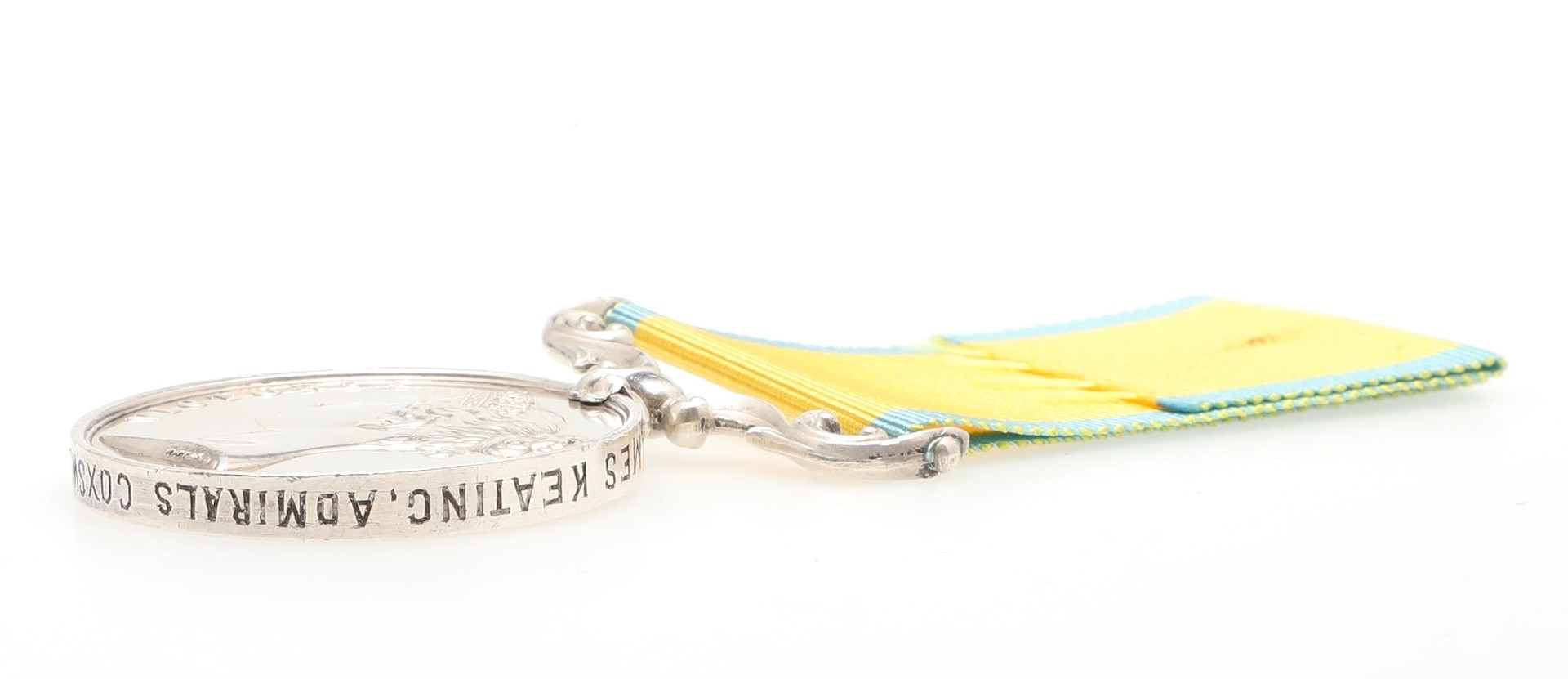A BALTIC MEDAL 1854-55 TO H.M.S. DUKE OF WELLINGTON AND A SURVIVOR OF THE DISASTER ABOARD H.M.S BOMBAY IN 1864. A Baltic Medal named to James Keating Admiral's Coxswain H.M.S. Duke of Wellington. James Keating was born in Dublin in 1825, he enlisted in 1846. During the Baltic campaign he served aboard H.M.S Neptune and Duke of Wellington, Admiral's Coxswain from 1864. Keating served Admiral Sir Charles G J B Elliot, most notably aboard H.M.S. Bombay which was destroyed during firing practice on the River Plate in 1864. An accident of unknown origin caused a catastrophic fire aboard the ship which led to the loss of 93 of the crew as well as the ship. The roll records a replacement issue for this award and it seems probable that the original medal was lost during the fire and a replacement issued with the rank as shown. Keating followed Admiral Elliot to H.M.S. Triton until June 1865, retiring in 1866. As an Admiral's Coxswain Keating will have have probably been a senior rating responsible for the Admiral's barge and crew of the barge. With copied research.