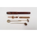 9ct gold bar brooch set with circular red stone and metal clasp, a gold-coloured chain-link bar brooch, three gold-coloured hat pins and 'The De La Rue Dainty' fountain pen with 14ct gold nib (3)