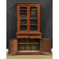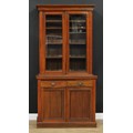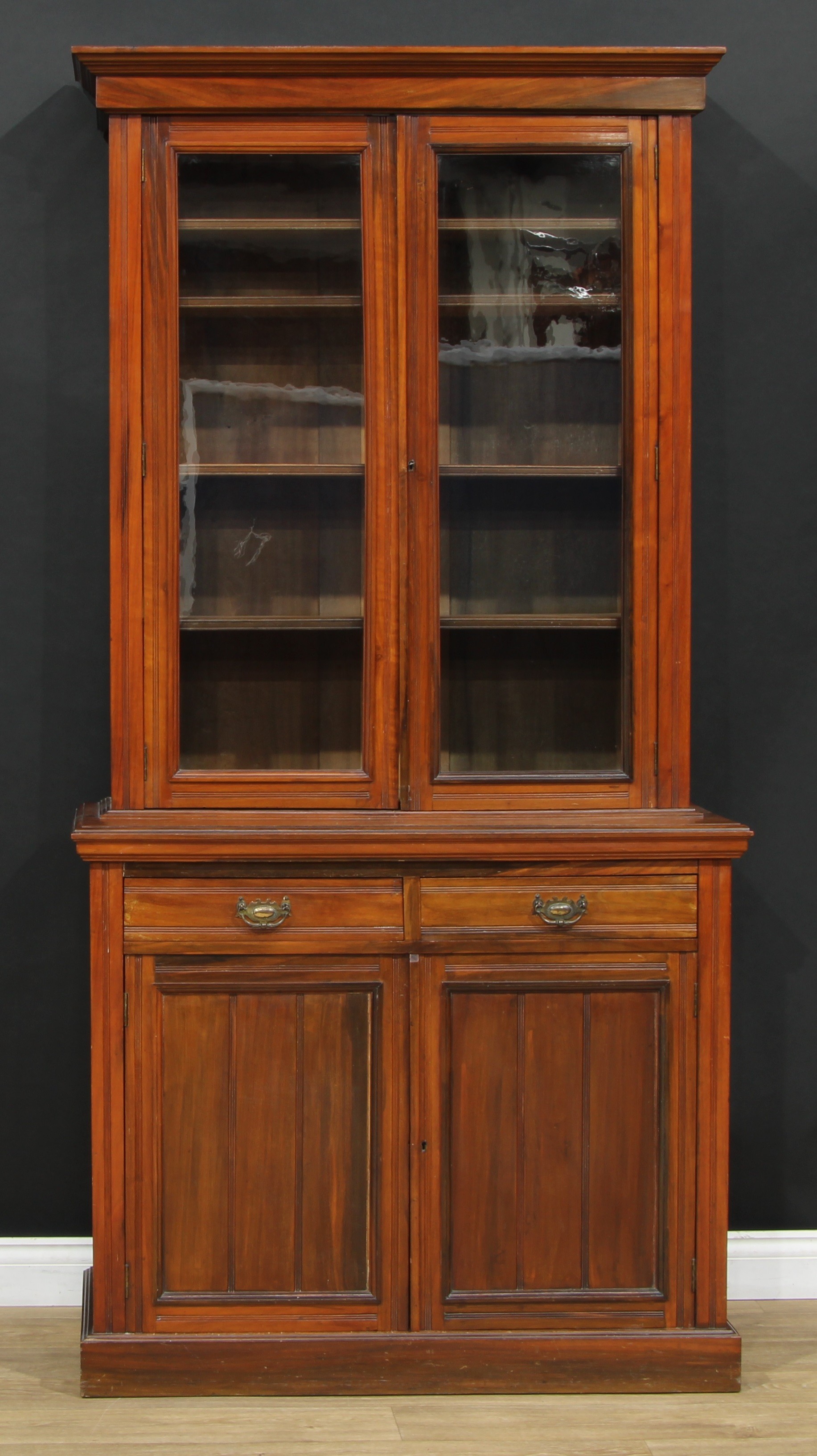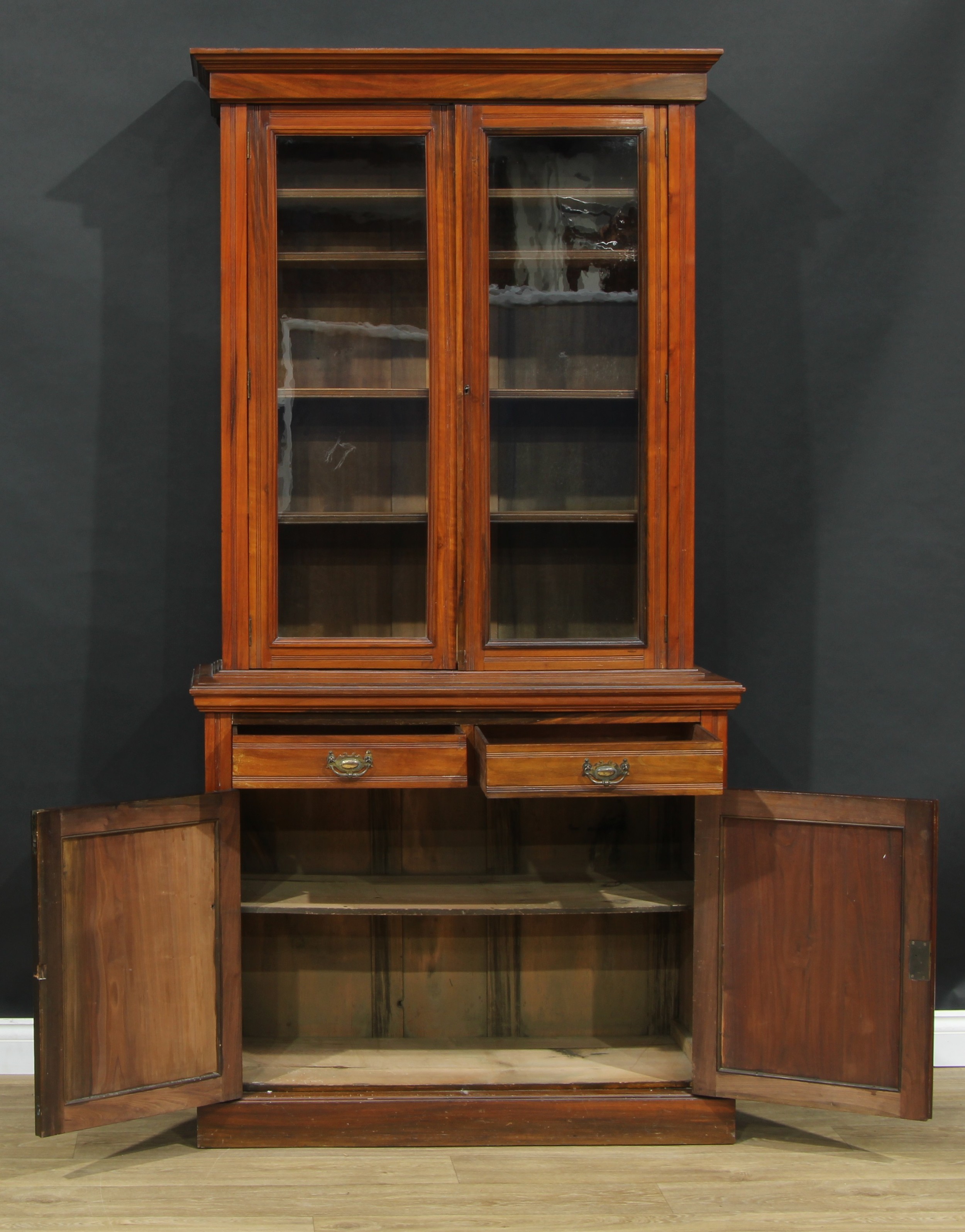 A late Victorian/Edwardian library bookcase, moulded cornice above a pair of glazed doors enclosing four shelves, the projecting base with a pair of short drawers above two panel doors enclosing a shelf, plinth base, 213cm high, 106.5cm wide, 43.5cm deep