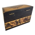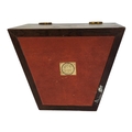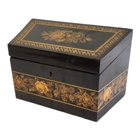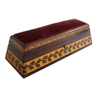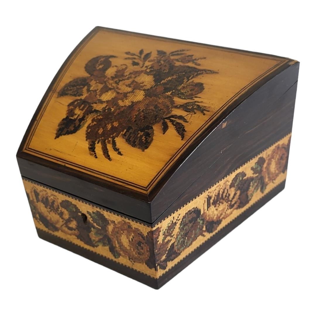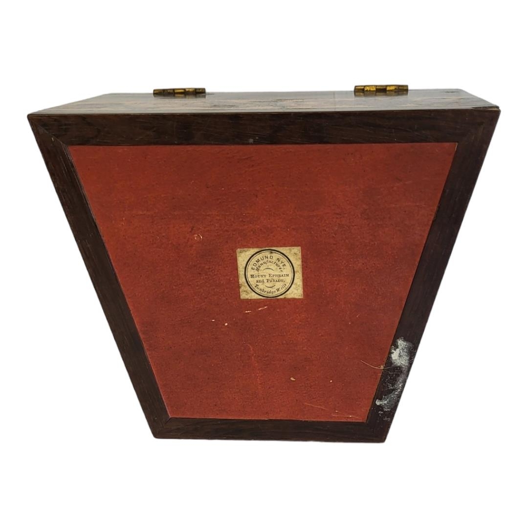 The cylindrical domed top inlaid with tesserae flower spray, the border with scroll border and crossbanding motifs, bearing original early Victorian paper label of Edmund Nye.