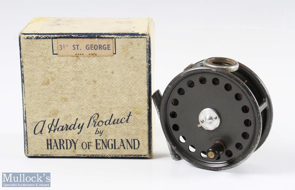 Hardy Bros St George 3 3/8" alloy fly reel with agate line guide (no cracks), rim tensioner, alloy smooth foot, quick release spool, light surface wear, comes with maker's original card box